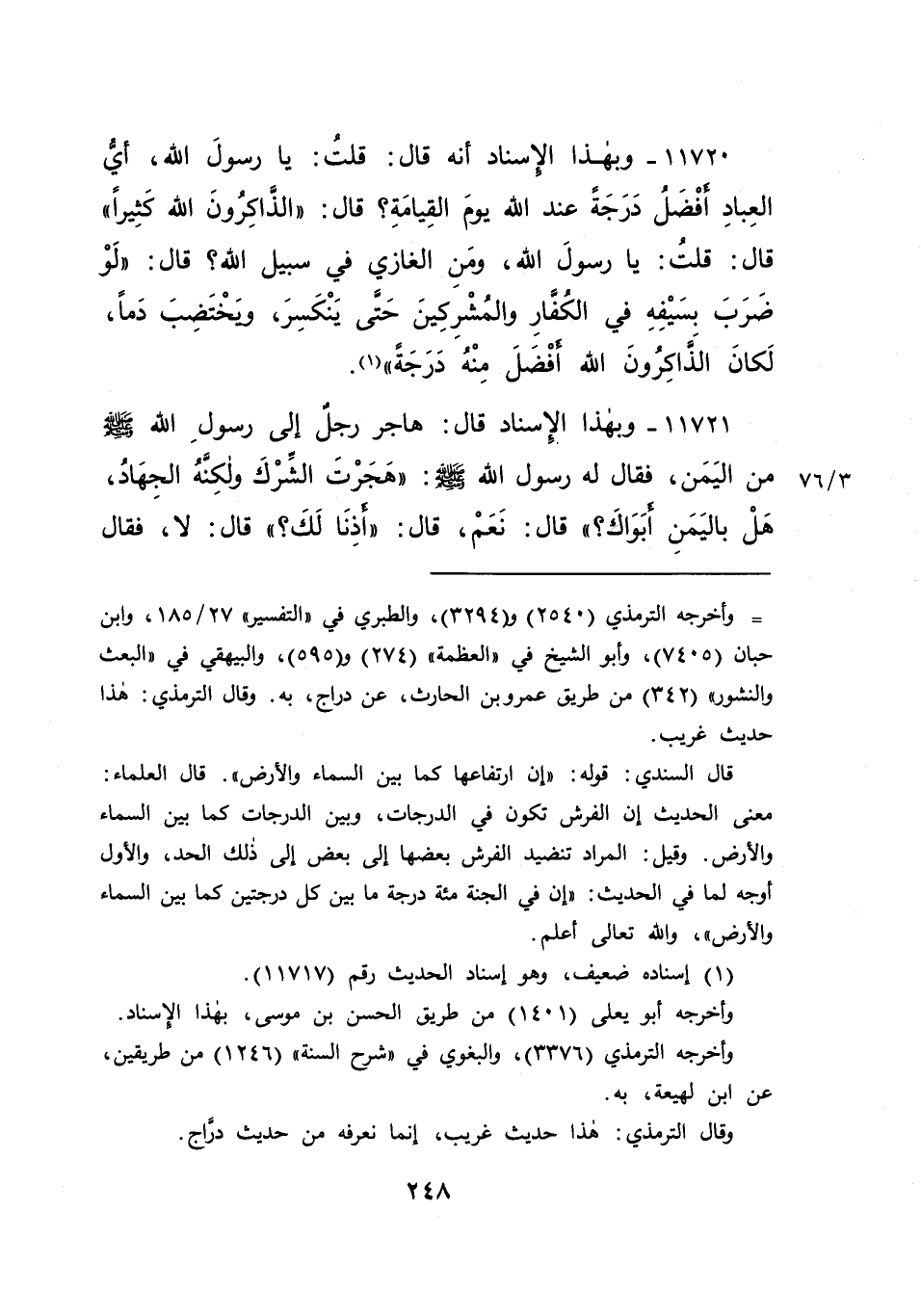 ١١٧٢٠ - وَبِهَذَا الْإِسْنَادِ أَنَّهُ قَالَ: قُلْتُ: يَا رَسُولَ اللهِ أَيُّ الْعِبَادِ أَفْضَلُ دَرَجَةً عِنْدَ اللهِ يَوْمَ الْقِيَامَةِ؟ قَالَ: " الذَّاكِرُونَ اللهَ كَثِيرًا " قَالَ: قُلْتُ: يَا رَسُولَ اللهِ، وَمَنِ الْغَازِي فِي سَبِيلِ اللهِ؟ قَالَ: " لَوْ ضَرَبَ بِسَيْفِهِ فِي الْكُفَّارِ وَالْمُشْرِكِينَ حَتَّى يَنْكَسِرَ، وَيَخْتَضِبَ دَمًا، لَكَانَ الذَّاكِرُونَ اللهَ أَفْضَلَ مِنْهُ دَرَجَةً " (١)