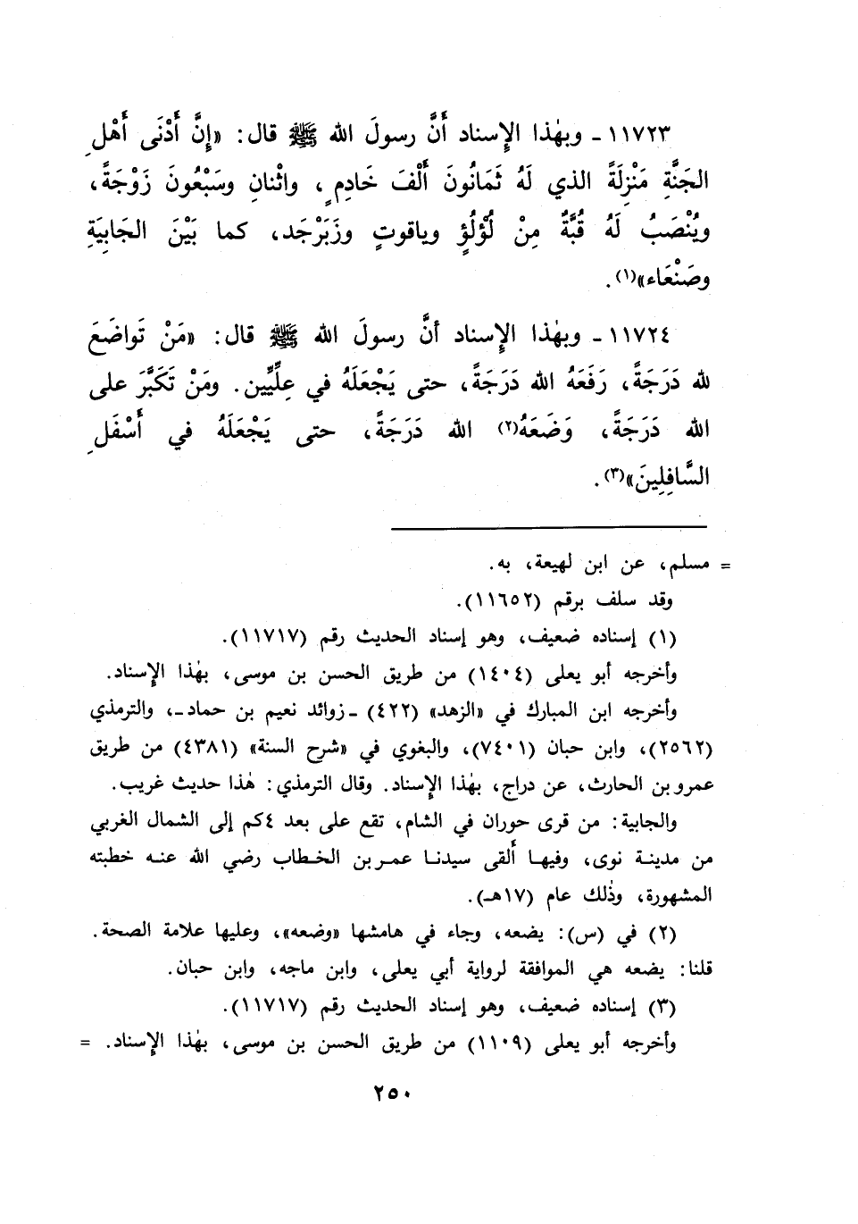 ١١٧٢٣ - وَبِهَذَا الْإِسْنَادِ، أَنَّ رَسُولَ اللهِ صَلَّى اللهُ عَلَيْهِ وَسَلَّمَ قَالَ: " إِنَّ أَدْنَى أَهْلِ الْجَنَّةِ مَنْزِلَةً، الَّذِي لَهُ ثَمَانُونَ أَلْفَ خَادِمٍ، وَاثْنَانِ وَسَبْعُونَ زَوْجَةً، وَيُنْصَبُ لَهُ قُبَّةٌ مِنْ لُؤْلُؤٍ، وَيَاقُوتٍ وَزَبَرْجَدٍ كَمَا بَيْنَ الْجَابِيَةِ وَصَنْعَاءَ " (١)
