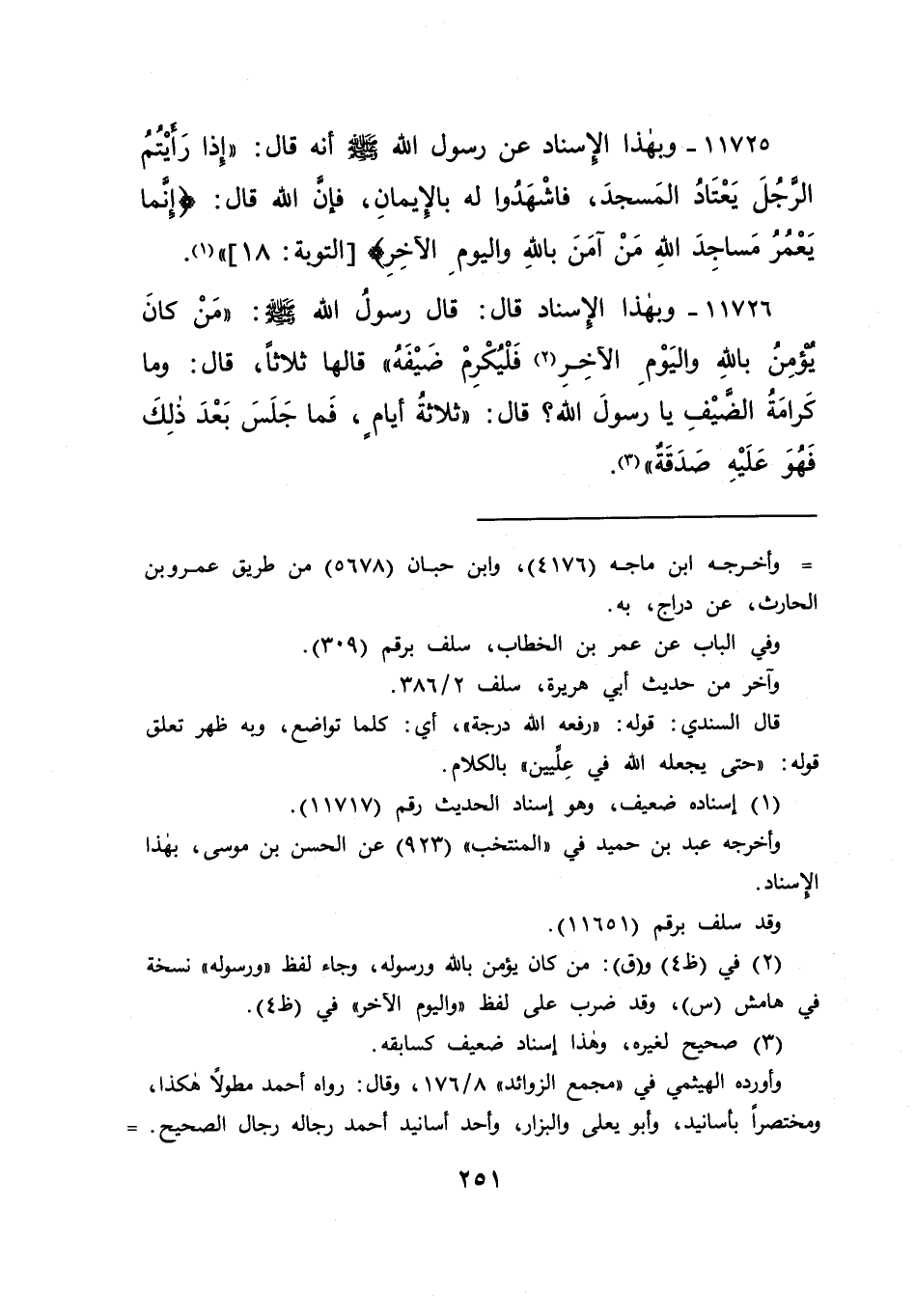 ١١٧٢٦ - وَبِهَذَا الْإِسْنَادِ، قَالَ: قَالَ رَسُولُ اللهِ صَلَّى اللهُ عَلَيْهِ وَسَلَّمَ " مَنْ كَانَ يُؤْمِنُ بِاللهِ وَالْيَوْمِ الْآخِرِ (٢) ، فَلْيُكْرِمْ ضَيْفَهُ " قَالَهَا ثَلَاثًا، قَالَ: وَمَا كَرَامَةُ الضَّيْفِ يَا رَسُولَ اللهِ؟ قَالَ: " ثَلَاثَةُ أَيَّامٍ، فَمَا جَلَسَ بَعْدَ ذَلِكَ، فَهُوَ عَلَيْهِ صَدَقَةٌ " (٣)