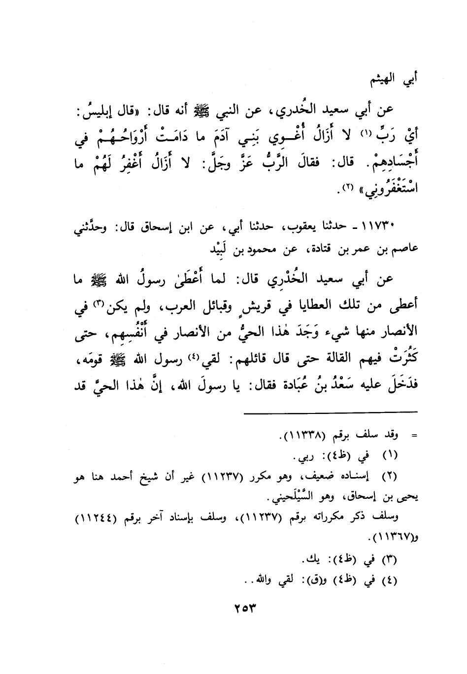 أَبِي الْهَيْثَمِ، عَنْ أَبِي سَعِيدٍ الْخُدْرِيِّ، عَنِ النَّبِيِّ صَلَّى اللهُ عَلَيْهِ وَسَلَّمَ أَنَّهُ قَالَ: " قَالَ إِبْلِيسُ: أَيْ رَبِّ (١) لَا أَزَالُ أُغْوِي بَنِي آدَمَ، مَا دَامَتْ أَرْوَاحُهُمْ فِي أَجْسَادِهِمْ "، قَالَ: " فَقَالَ الرَّبُّ عَزَّ وَجَلَّ: " لَا أَزَالُ أَغْفِرُ لَهُمْ، مَا اسْتَغْفَرُونِي " (٢)