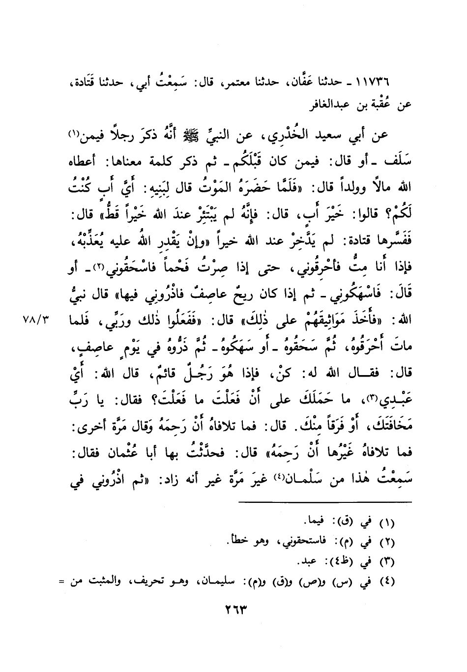 ١١٧٣٦ - حَدَّثَنَا عَفَّانُ، حَدَّثَنَا مُعْتَمِرٌ، قَالَ: سَمِعْتُ أَبِي، حَدَّثَنَا قَتَادَةُ، عَنْ عُقْبَةَ بْنِ عَبْدِ الْغَافِرِ، عَنْ أَبِي سَعِيدٍ الْخُدْرِيِّ، عَنِ النَّبِيِّ صَلَّى اللهُ عَلَيْهِ وَسَلَّمَ أَنَّهُ ذَكَرَ رَجُلًا فِيمَنْ (١) سَلَفَ، أَوْ قَالَ: فِيمَنْ كَانَ قَبْلَكُمْ، ثُمَّ ذَكَرَ كَلِمَةً مَعْنَاهَا أَعْطَاهُ اللهُ مَالًا وَوَلَدًا قَالَ: " فَلَمَّا حَضَرَهُ الْمَوْتُ قَالَ لِبَنِيهِ: أَيَّ أَبٍ كُنْتُ لَكُمْ؟ قَالُوا: خَيْرَ أَبٍ، قَالَ: فَإِنَّهُ لَمْ يَبْتَئِرْ عِنْدَ اللهِ خَيْرًا قَطُّ - قَالَ: فَفَسَّرَهَا قَتَادَةُ: لَمْ يَدَّخِرْ عِنْدَ اللهِ خَيْرًا - وَإِنْ يَقْدِرِ اللهُ عَلَيْهِ يُعَذِّبْهُ، فَإِذَا أَنَا مُتُّ، فَأَحْرِقُونِي، حَتَّى إِذَا صِرْتُ فَحْمًا، فَاسْحَقُونِي (٢) -، أَوْ قَالَ: فَاسْهَكُونِي - ثُمَّ إِذَا كَانَ رِيحٌ عَاصِفٌ فَاذْرُونِي فِيهَا "، قَالَ نَبِيُّ اللهِ: " فَأَخَذَ مَوَاثِيقَهُمْ عَلَى ذَلِكَ "، قَالَ: " فَفَعَلُوا ذَلِكَ وَرَبِّي، فَلَمَّا مَاتَ أَحْرَقُوهُ، ثُمَّ سَحَقُوهُ - أَوْ سَهَكُوهُ - ثُمَّ ذَرُّوهُ فِي يَوْمٍ عَاصِفٍ، قَالَ: فَقَالَ اللهُ لَهُ: كُنْ، فَإِذَا هُوَ رَجُلٌ قَائِمٌ، قَالَ اللهُ: أَيْ عَبْدِي، (٣) مَا حَمَلَكَ عَلَى أَنْ فَعَلْتَ مَا فَعَلْتَ؟ فَقَالَ: يَا رَبِّ مَخَافَتَكَ، أَوْ فَرَقًا مِنْكَ. قَالَ: فَمَا تَلَافَاهُ أَنْ رَحِمَهُ، وَقَالَ مَرَّةً أُخْرَى: فَمَا تَلَافَاهُ غَيْرُهَا أَنْ رَحِمَهُ " قَالَ: فَحَدَّثْتُ بِهَا أَبَا عُثْمَانَ فَقَالَ: سَمِعْتُ هَذَا مِنْ سَلْمَانَ (٤) غَيْرَ مَرَّةٍ غَيْرَ أَنَّهُ زَادَ،: " ثُمَّ أَذْرُونِي فِي