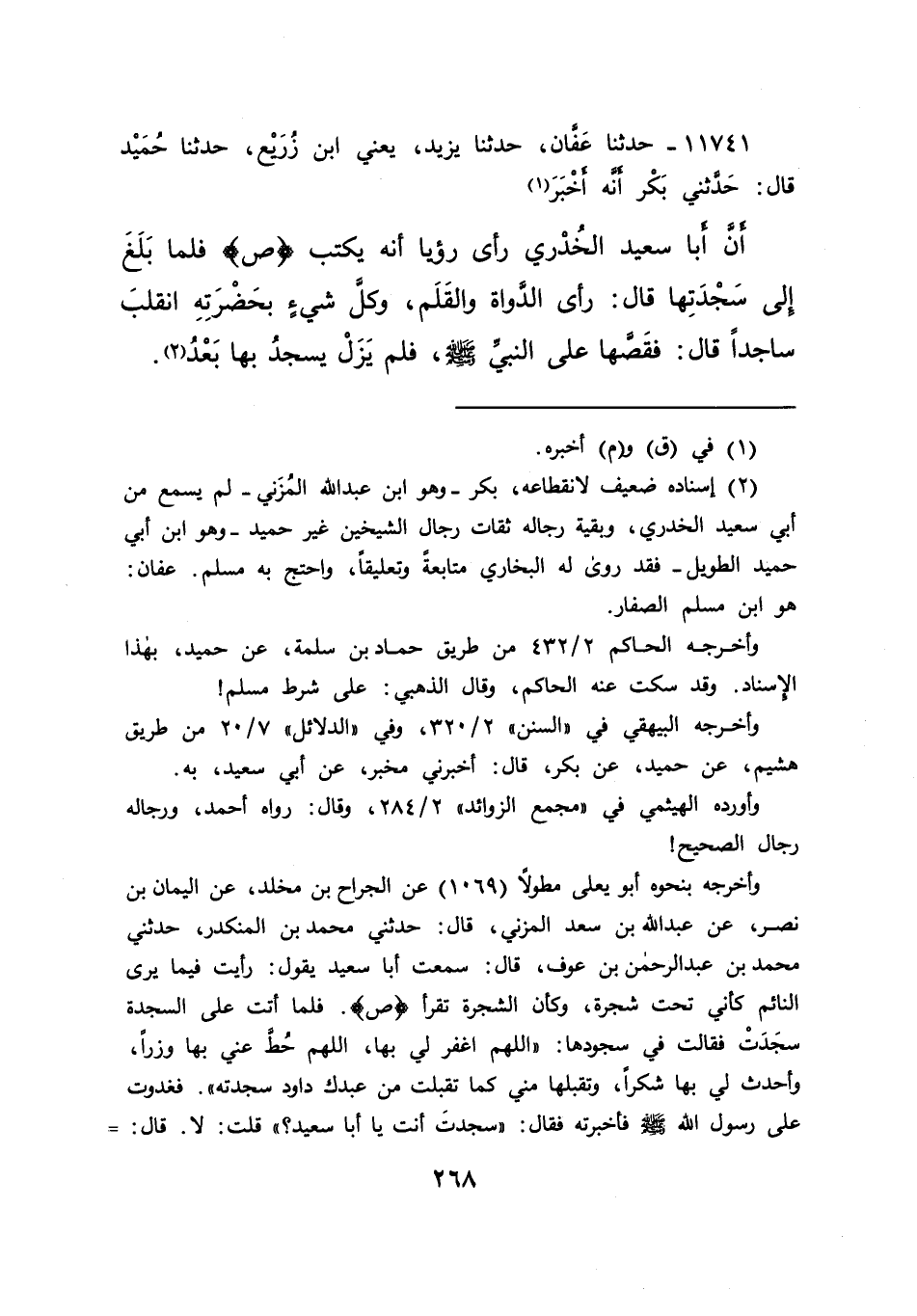 ١١٧٤١ - حَدَّثَنَا عَفَّانُ، حَدَّثَنَا يَزِيدُ يَعْنِي ابْنَ زُرَيْعٍ، حَدَّثَنَا حُمَيْدٌ، قَالَ: حَدَّثَنِي بَكْرٌ، أَنَّهُ أُخْبِرَ (١) أَنَّ أَبَا سَعِيدٍ الْخُدْرِيَّ رَأَى رُؤْيَا أَنَّهُ يَكْتُبُ ص فَلَمَّا بَلَغَ إِلَى سَجْدَتِهَا قَالَ: رَأَى الدَّوَاةَ وَالْقَلَمَ، وَكُلَّ شَيْءٍ بِحَضْرَتِهِ، انْقَلَبَ سَاجِدًا، قَالَ: فَقَصَّهَا عَلَى النَّبِيِّ صَلَّى اللهُ عَلَيْهِ وَسَلَّمَ، " فَلَمْ يَزَلْ يَسْجُدُ بِهَا بَعْدُ " (٢)