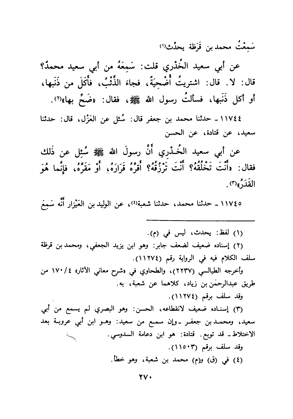 ١١٧٤٤ - حَدَّثَنَا مُحَمَّدُ بْنُ جَعْفَرٍ، قَالَ: سُئِلَ عَنِ الْعَزْلِ قَالَ: حَدَّثَنَا سَعِيدٌ، عَنْ قَتَادَةَ، عَنْ الْحَسَنِ، عَنْ أَبِي سَعِيدٍ الْخُدْرِيِّ، أَنَّ رَسُولَ اللهِ صَلَّى اللهُ عَلَيْهِ وَسَلَّمَ سُئِلَ عَنْ ذَلِكَ، فَقَالَ: " أَنْتَ تَخْلُقُهُ؟ أَنْتَ تَرْزُقُهُ؟ أَقِرَّهُ قَرَارَهُ، أَوْ مَقَرَّهُ، فَإِنَّمَا هُوَ الْقَدَرُ " (٣)