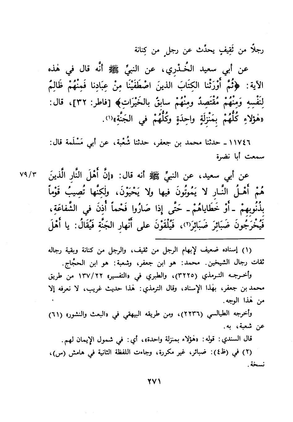 رَجُلًا مِنْ ثَقِيفٍ، يُحَدِّثُ عَنْ رَجُلٍ مِنْ كِنَانَةَ، عَنْ أَبِي سَعِيدٍ الْخُدْرِيِّ، عَنِ النَّبِيِّ صَلَّى اللهُ عَلَيْهِ وَسَلَّمَ أَنَّهُ قَالَ فِي هَذِهِ الْآيَةِ: {ثُمَّ أَوْرَثْنَا الْكِتَابَ الَّذِينَ اصْطَفَيْنَا مِنْ عِبَادِنَا فَمِنْهُمْ ظَالِمٌ لِنَفْسِهِ وَمِنْهُمْ مُقْتَصِدٌ وَمِنْهُمْ سَابِقٌ بِالْخَيْرَاتِ} [فاطر: ٣٢] قَالَ: " هَؤُلَاءِ كُلُّهُمْ بِمَنْزِلَةٍ وَاحِدَةٍ، وَكُلُّهُمْ فِي الْجَنَّةِ " (١)