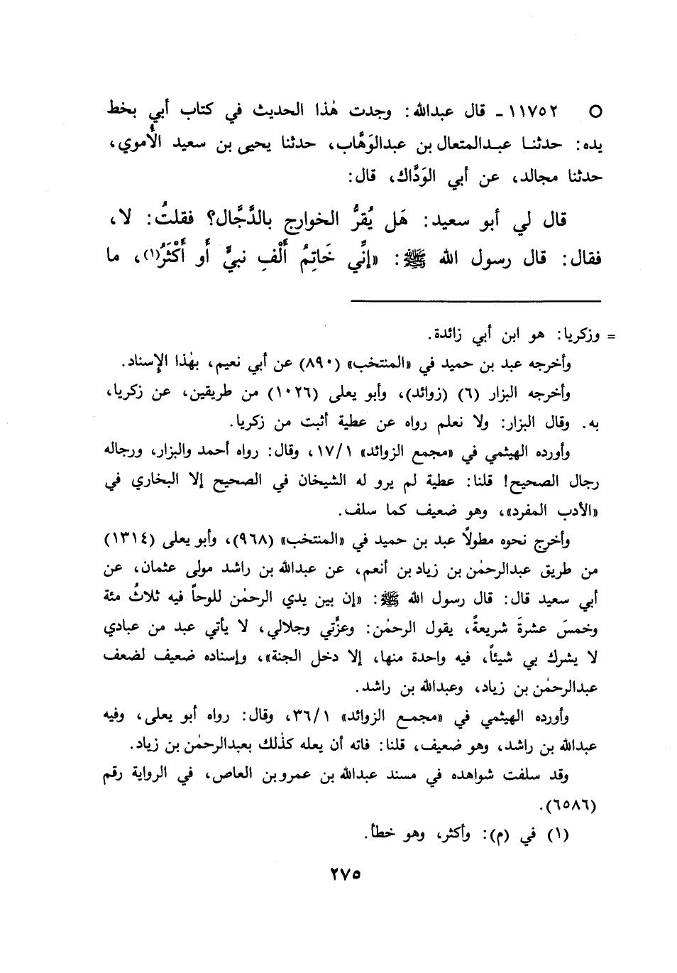 ° ١١٧٥٢ - قَالَ عَبْدُ اللهِ: وَجَدْتُ هَذَا الْحَدِيثَ فِي كِتَابِ أبي بِخَطِّ يَدِهِ: حَدَّثَنَا عَبْدُ الْمُتَعَالِ بْنُ عَبْدِ الْوَهَّابِ، حَدَّثَنَا يَحْيَى بْنُ سَعِيدٍ الْأُمَوِيُّ، حَدَّثَنَا مُجَالِدٌ، عَنْ أَبِي الْوَدَّاكِ، قَالَ: قَالَ لِي أَبُو سَعِيدٍ: هَلْ يُقِرُّ الْخَوَارِجُ بِالدَّجَّالِ؟ فَقُلْتُ: لَا. فَقَالَ: قَالَ رَسُولُ اللهِ صَلَّى اللهُ عَلَيْهِ وَسَلَّمَ: " إِنِّي خَاتَمُ أَلْفِ نَبِيٍّ، وَأَكْثَرُ (١) مَا