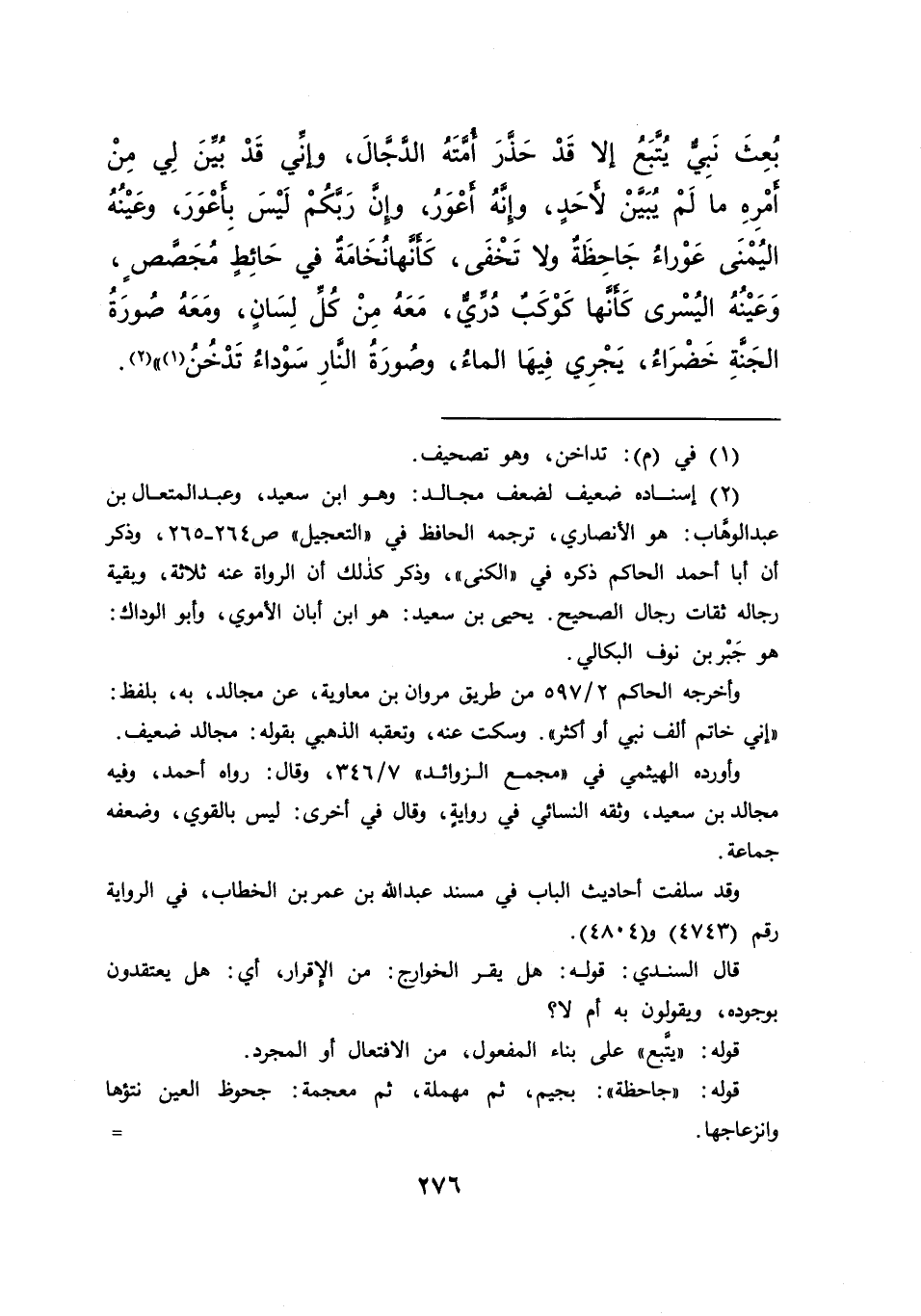 بُعِثَ نَبِيٌّ يُتَّبَعُ، إِلَّا قَدْ حَذَّرَ أُمَّتَهُ الدَّجَّالَ، وَإِنِّي قَدْ بُيِّنَ لِي مِنْ أَمْرِهِ مَا لَمْ يُبَيَّنْ لِأَحَدٍ، وَإِنَّهُ أَعْوَرُ وَإِنَّ رَبَّكُمْ لَيْسَ بِأَعْوَرَ، وَعَيْنُهُ الْيُمْنَى عَوْرَاءُ جَاحِظَةٌ، وَلَا تَخْفَى كَأَنَّهَا نُخَامَةٌ فِي حَائِطٍ مُجَصَّصٍ، وَعَيْنُهُ الْيُسْرَى كَأَنَّهَا كَوْكَبٌ دُرِّيٌّ، مَعَهُ مِنْ كُلِّ لِسَانٍ، وَمَعَهُ صُورَةُ الْجَنَّةِ خَضْرَاءُ، يَجْرِي فِيهَا الْمَاءُ، وَصُورَةُ النَّارِ سَوْدَاءُ تَدَّاخَنُ (١) " (٢)