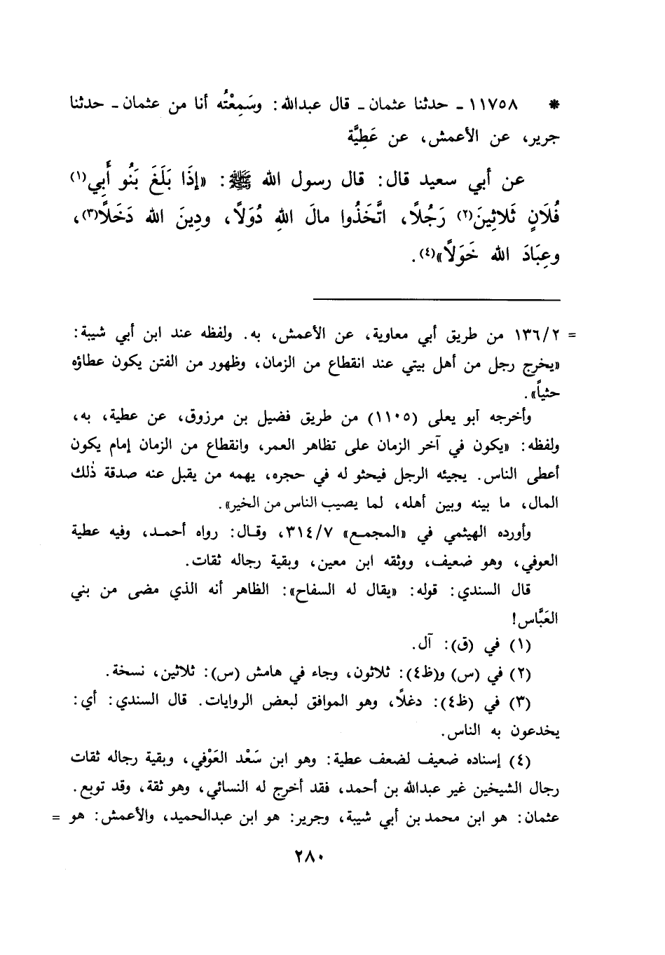 * ١١٧٥٨ - حَدَّثَنَا عُثْمَانُ، قَالَ عَبْدُ اللهِ: وَسَمِعْتُهُ أَنَا مِنْ عُثْمَانَ، حَدَّثَنَا جَرِيرٌ، عَنْ الْأَعْمَشِ، عَنْ عَطِيَّةَ، عَنْ أَبِي سَعِيدٍ قَالَ: قَالَ رَسُولُ اللهِ صَلَّى اللهُ عَلَيْهِ وَسَلَّمَ: " إِذَا بَلَغَ بَنُو أَبِي (١) فُلَانٍ ثَلَاثِينَ (٢) رَجُلًا، اتَّخَذُوا مَالَ اللهِ دُوَلًا، وَدِينَ اللهِ دَخَلًا، (٣) وَعِبَادَ اللهِ خَوَلًا " (٤)
