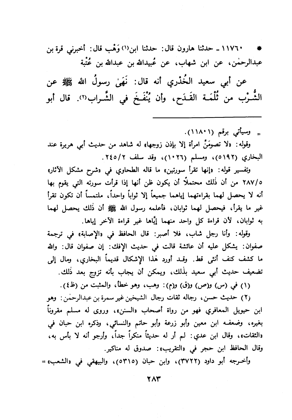 * ١١٧٦٠ - حَدَّثَنَا هَارُونُ قَالَ: حَدَّثَنَا ابْنُ (١) وَهْبٍ، قَالَ: أَخْبَرَنِي قُرَّةُ بْنُ عَبْدِ الرَّحْمَنِ، عَنْ ابْنِ شِهَابٍ، عَنْ عُبَيْدِ اللهِ بْنِ عَبْدِ اللهِ بْنِ عُتْبَةَ، عَنْ أَبِي سَعِيدٍ الْخُدْرِيِّ أَنَّهُ قَالَ: " نَهَى رَسُولُ اللهِ صَلَّى اللهُ عَلَيْهِ وَسَلَّمَ عَنِ الشُّرْبِ مِنْ ثُلْمَةِ الْقَدَحِ، وَأَنْ يُنْفَخَ فِي الشَّرَابِ " (٢) قَالَ أَبُو