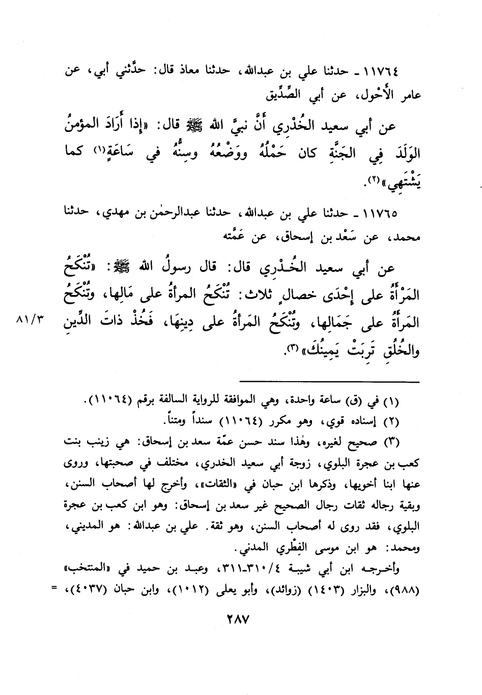 ١١٧٦٤ - حَدَّثَنَا عَلِيُّ بْنُ عَبْدِ اللهِ، حَدَّثَنَا مُعَاذٌ، قَالَ: حَدَّثَنِي أَبِي، عَنْ عَامِرٍ الْأَحْوَلِ، عَنْ أَبِي الصِّدِّيقِ، عَنْ أَبِي سَعِيدٍ الْخُدْرِيِّ أَنَّ نَبِيَّ اللهِ صَلَّى اللهُ عَلَيْهِ وَسَلَّمَ قَالَ: " إِذَا أَرَادَ الْمُؤْمِنُ الْوَلَدَ فِي الْجَنَّةِ كَانَ حَمْلُهُ وَوَضْعُهُ وَسِنُّهُ فِي سَاعَةٍ (١) كَمَا يَشْتَهِي " (٢)