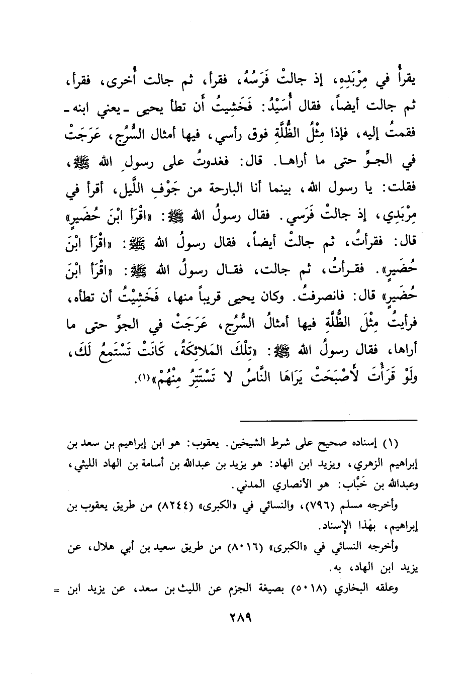 يَقْرَأُ فِي مِرْبَدِهِ، إِذْ جَالَتْ فَرَسُهُ، فَقَرَأَ، ثُمَّ جَالَتْ أُخْرَى، فَقَرَأَ، ثُمَّ جَالَتْ أَيْضًا، فَقَالَ أُسَيْدٌ: فَخَشِيتُ أَنْ تَطَأَ يَحْيَى - يَعْنِي ابْنَهُ - فَقُمْتُ إِلَيْهِ، فَإِذَا مِثْلُ الظُّلَّةِ فَوْقَ رَأْسِي، فِيهَا أَمْثَالُ السُّرُجِ، عَرَجَتْ فِي الْجَوِّ حَتَّى مَا أَرَاهَا، قَالَ: فَغَدَوْتُ عَلَى رَسُولِ اللهِ صَلَّى اللهُ عَلَيْهِ وَسَلَّمَ فَقُلْتُ: يَا رَسُولَ اللهِ، بَيْنَمَا أَنَا الْبَارِحَةَ مِنْ جَوْفِ اللَّيْلِ أَقْرَأُ فِي مِرْبَدِي إِذْ جَالَتْ فَرَسِي، فَقَالَ رَسُولُ اللهِ صَلَّى اللهُ عَلَيْهِ وَسَلَّمَ: " اقْرَأْ ابْنَ حُضَيْرٍ "، قَالَ: فَقَرَأْتُ، ثُمَّ جَالَتْ أَيْضًا، فَقَالَ رَسُولُ اللهِ صَلَّى اللهُ عَلَيْهِ وَسَلَّمَ: " اقْرَأْ ابْنَ حُضَيْرٍ ". فَقَرَأْتُ ثُمَّ جَالَتْ، فَقَالَ رَسُولُ اللهِ صَلَّى اللهُ عَلَيْهِ وَسَلَّمَ: " اقْرَأْ ابْنَ حُضَيْرٍ ". قَالَ: فَانْصَرَفْتُ وَكَانَ يَحْيَى قَرِيبًا مِنْهَا، فَخَشِيتُ أَنْ تَطَأَهُ، فَرَأَيْتُ مِثْلَ الظُّلَّةِ فِيهَا أَمْثَالُ السُّرُجِ عَرَجَتْ فِي الْجَوِّ حَتَّى مَا أَرَاهَا، فَقَالَ رَسُولُ اللهِ صَلَّى اللهُ عَلَيْهِ وَسَلَّمَ: " تِلْكَ الْمَلَائِكَةُ كَانَتْ تَسْتَمِعُ لَكَ، وَلَوْ قَرَأْتَ لَأَصْبَحَتْ يَرَاهَا النَّاسُ، لَا تَسْتَتِرُ مِنْهُمْ " (١)