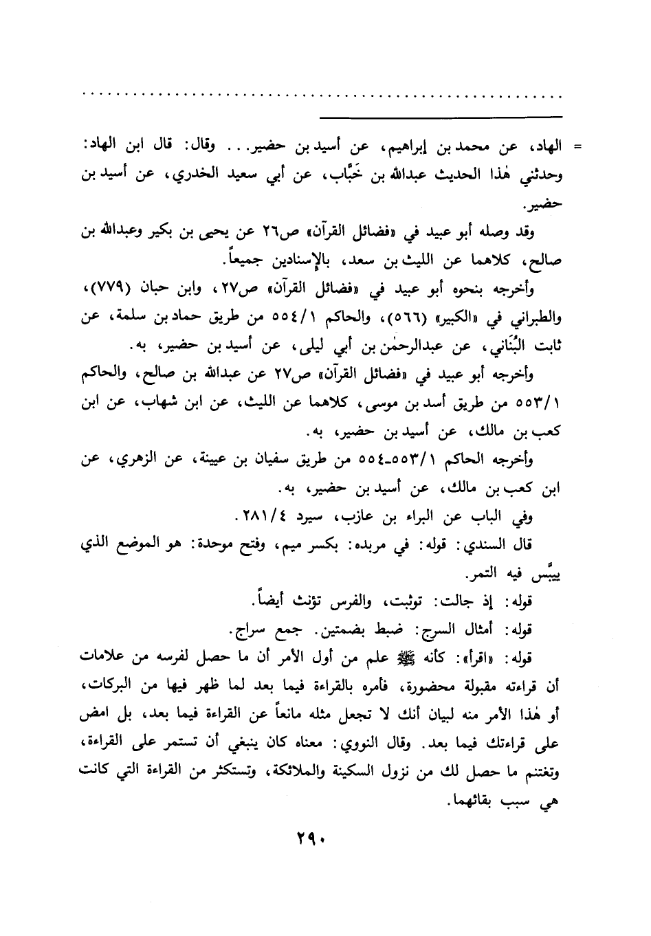الهاد، عن محمد بن إبراهيم، عن أسيد بن حضير ... وقال: قال ابن الهاد: وحدثني هذا الحديث عبد الله بن خَباب، عن أبي سعيد الخدري، عن أسيد بن حضير.