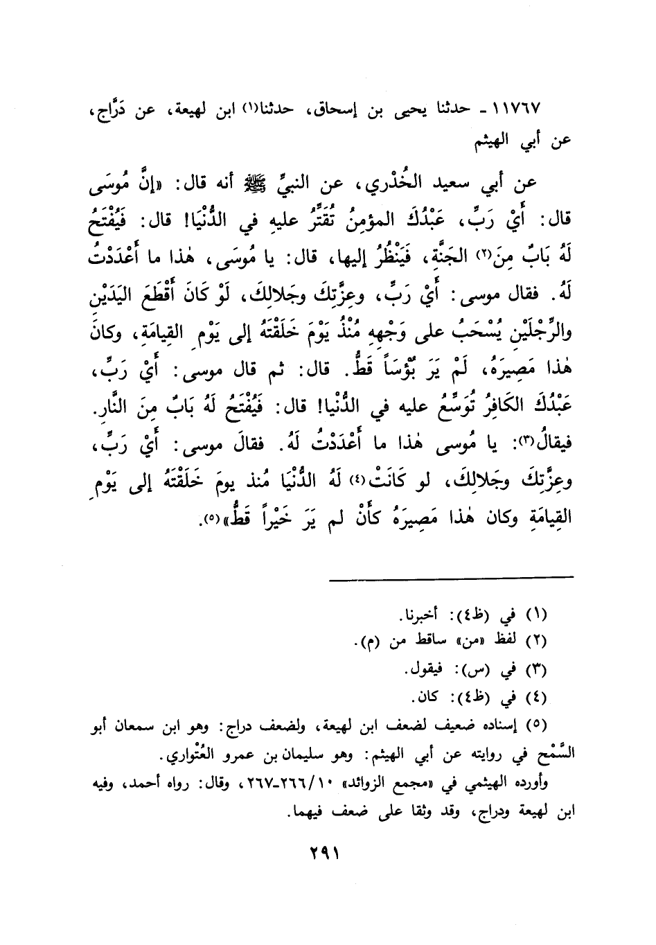 ١١٧٦٧ - حَدَّثَنَا يَحْيَى بْنُ إِسْحَاقَ، حَدَّثَنَا (١) ابْنُ لَهِيعَةَ، عَنْ دَرَّاجٍ، عَنْ أَبِي الْهَيْثَمِ، عَنْ أَبِي سَعِيدٍ الْخُدْرِيِّ، عَنِ النَّبِيِّ صَلَّى اللهُ عَلَيْهِ وَسَلَّمَ أَنَّهُ قَالَ: " إِنَّ مُوسَى قَالَ: أَيْ رَبِّ، عَبْدُكَ الْمُؤْمِنُ تُقَتَّرُ عَلَيْهِ فِي الدُّنْيَا، قَالَ: فَيُفْتَحُ لَهُ بَابُ من (٢) الْجَنَّةِ، فَيَنْظُرُ إِلَيْهَا، قَالَ: يَا مُوسَى هَذَا مَا أَعْدَدْتُ لَهُ، فَقَالَ مُوسَى: أَيْ رَبِّ، وَعِزَّتِكَ وَجَلَالِكَ لَوْ كَانَ أَقْطَعَ الْيَدَيْنِ وَالرِّجْلَيْنِ، يُسْحَبُ عَلَى وَجْهِهِ مُنْذُ يَوْمَ خَلَقْتَهُ إِلَى يَوْمِ الْقِيَامَةِ، وَكَانَ هَذَا مَصِيرَهُ، لَمْ يَرَ بُؤْسًا قَطُّ، قَالَ: ثُمَّ قَالَ مُوسَى: أَيْ رَبِّ، عَبْدُكَ الْكَافِرُ تُوَسِّعُ عَلَيْهِ فِي الدُّنْيَا، قَالَ: فَيُفْتَحُ لَهُ بَابٌ مِنَ النَّارِ، فَيُقَالُ (٣) : يَا مُوسَى هَذَا مَا أَعْدَدْتُ لَهُ، فَقَالَ مُوسَى: أَيْ رَبِّ، وَعِزَّتِكَ وَجَلَالِكَ، لَوْ كَانَتْ (٤) لَهُ الدُّنْيَا، مُنْذُ يَوْمَ خَلَقْتَهُ، إِلَى يَوْمِ الْقِيَامَةِ، وَكَانَ هَذَا مَصِيرَهُ، كَأَنْ لَمْ يَرَ خَيْرًا قَطُّ " (٥)