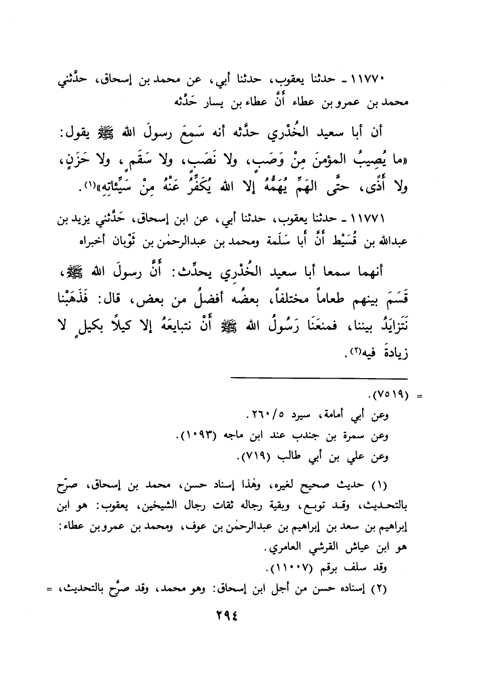 ١١٧٧٠ - حَدَّثَنَا يَعْقُوبُ، حَدَّثَنَا أَبِي، عَنْ مُحَمَّدِ بْنِ إِسْحَاقَ، حَدَّثَنِي مُحَمَّدُ بْنُ عَمْرِو بْنِ عَطَاءٍ، أَنَّ عَطَاءَ بْنَ يَسَارٍ حَدَّثَهُ، أَنَّ أَبَا سَعِيدٍ الْخُدْرِيَّ حَدَّثَهُ، أَنَّهُ سَمِعَ رَسُولَ اللهِ صَلَّى اللهُ عَلَيْهِ وَسَلَّمَ يَقُولُ: " مَا يُصِيبُ الْمُؤْمِنَ مِنْ وَصَبٍ، وَلَا نَصَبٍ، وَلَا سَقَمٍ، وَلَا حَزَنٍ، وَلَا أَذًى، حَتَّى الْهَمِّ يُهِمُّهُ، إِلَّا اللهُ يُكَفِّرُ عَنْهُ مِنْ سَيِّئَاتِهِ " (١)