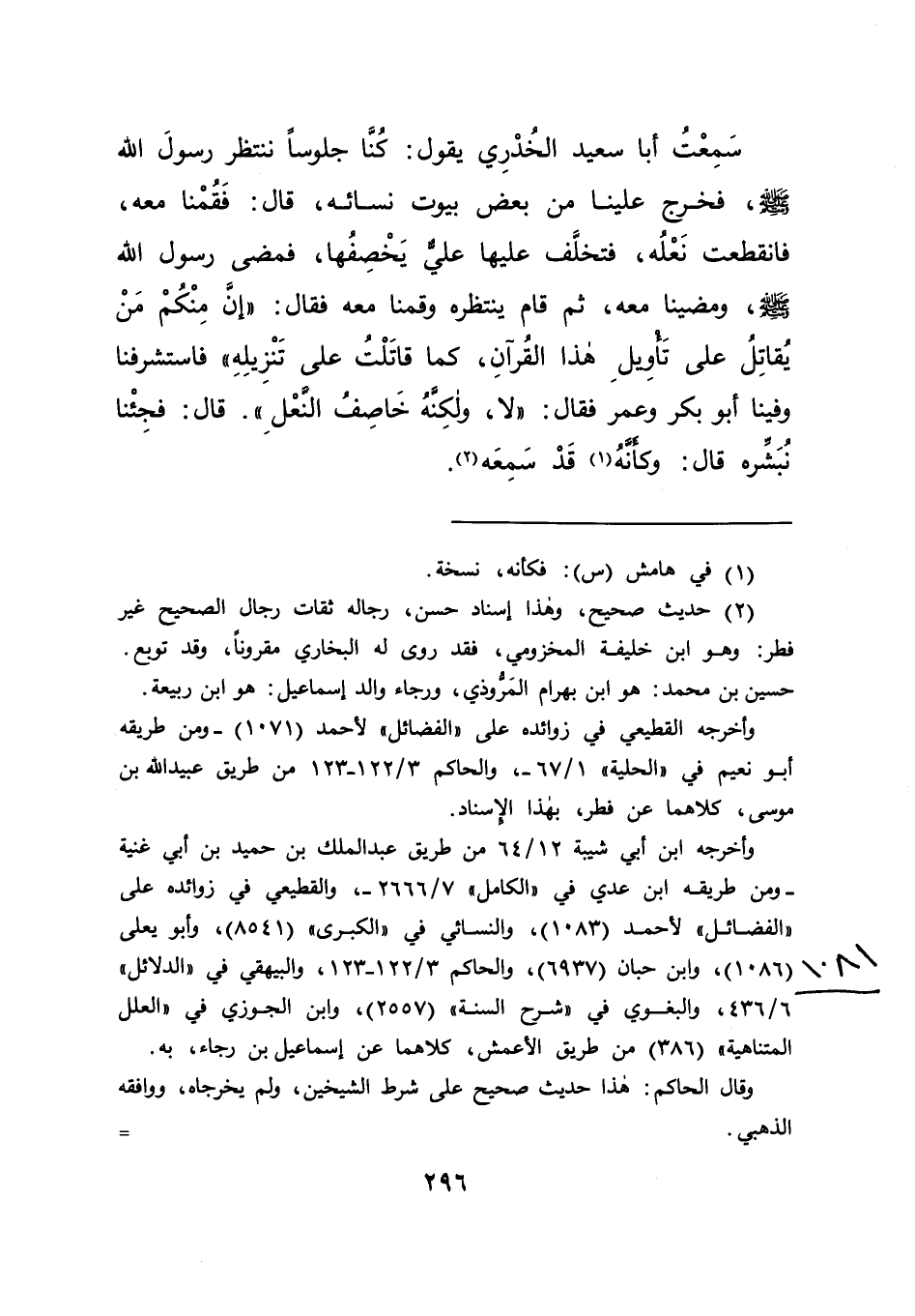 سَمِعْتُ أَبَا سَعِيدٍ الْخُدْرِيَّ يَقُولُ: كُنَّا جُلُوسًا نَنْتَظِرُ رَسُولَ اللهِ صَلَّى اللهُ عَلَيْهِ وَسَلَّمَ، فَخَرَجَ عَلَيْنَا مِنْ بَعْضِ بُيُوتِ نِسَائِهِ، قَالَ: فَقُمْنَا مَعَهُ، فَانْقَطَعَتْ نَعْلُهُ، فَتَخَلَّفَ عَلَيْهَا عَلِيٌّ يَخْصِفُهَا، فَمَضَى رَسُولُ اللهِ صَلَّى اللهُ عَلَيْهِ وَسَلَّمَ وَمَضَيْنَا مَعَهُ، ثُمَّ قَامَ يَنْتَظِرُهُ وَقُمْنَا مَعَهُ، فَقَالَ: " إِنَّ مِنْكُمْ مَنْ يُقَاتِلُ عَلَى تَأْوِيلِ هَذَا الْقُرْآنِ، كَمَا قَاتَلْتُ عَلَى تَنْزِيلِهِ "، فَاسْتَشْرَفْنَا وَفِينَا أَبُو بَكْرٍ وَعُمَرُ فَقَالَ: " لَا، وَلَكِنَّهُ خَاصِفُ النَّعْلِ ". قَالَ: فَجِئْنَا نُبَشِّرُهُ، قَالَ: وَكَأَنَّهُ (١) قَدْ سَمِعَهُ (٢)