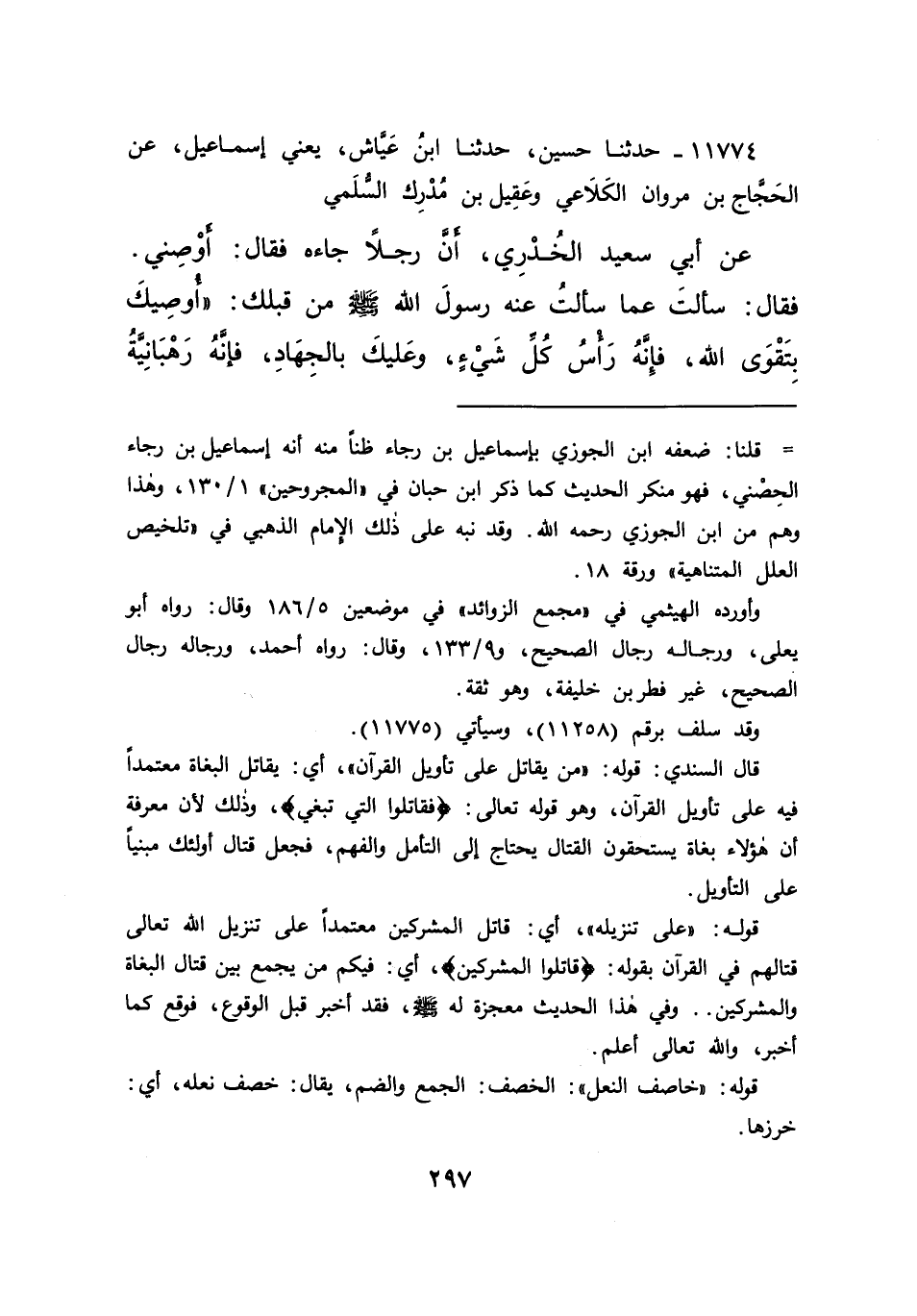 ١١٧٧٤ - حَدَّثَنَا حُسَيْنٌ، حَدَّثَنَا ابْنُ عَيَّاشٍ يَعْنِي إِسْمَاعِيلَ، عَنِ الْحَجَّاجِ بْنِ مَرْوَانَ الْكَلَاعِيِّ، وَعَقِيلِ بْنِ مُدْرِكٍ السُّلَمِيِّ، عَنْ أَبِي سَعِيدٍ الْخُدْرِيِّ، أَنَّ رَجُلًا جَاءَهُ فَقَالَ: أَوْصِنِي. فَقَالَ: سَأَلْتَ عَمَّا سَأَلْتُ عَنْهُ رَسُولَ اللهِ صَلَّى اللهُ عَلَيْهِ وَسَلَّمَ مِنْ قَبْلِكَ، " أُوصِيكَ بِتَقْوَى اللهِ، فَإِنَّهُ رَأْسُ كُلِّ شَيْءٍ، وَعَلَيْكَ بِالْجِهَادِ، فَإِنَّهُ رَهْبَانِيَّةُ