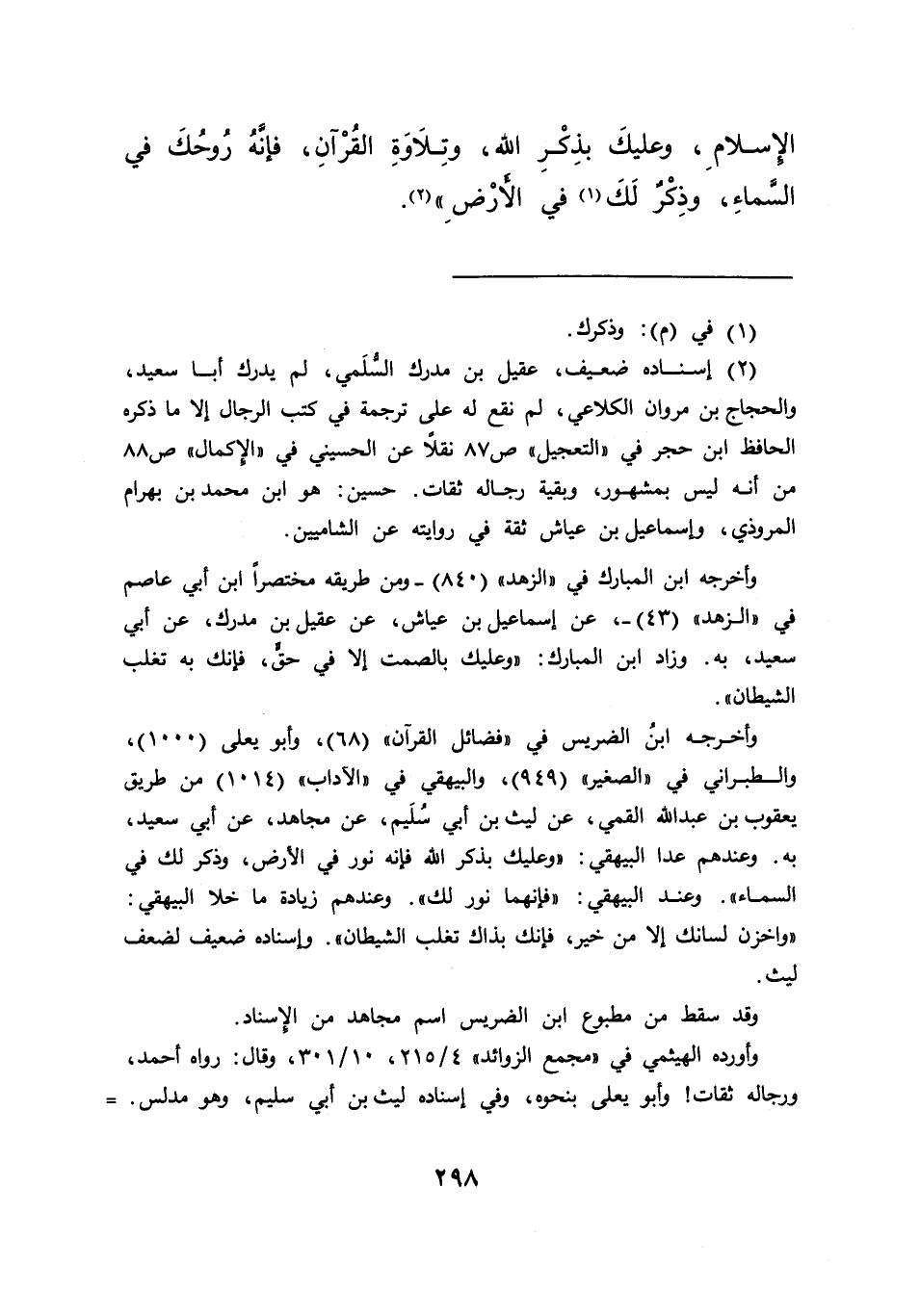 وأخرجه ابنُ الضريس في "فضائل القرآن" (٦٨) ، وأبو يعلى (١٠٠٠) ، والطبراني في "الصغير" (٩٤٩) ، والبيهقي في "الآداب" (١٠١٤) من طريق يعقوب بن عبد الله القمي، عن ليث بن أبي سُلَيم، عن مجاهد، عن أبي سعيد، به. وعندهم عدا البيهقي: "وعليك بذكر الله فإنه نور في الأرض، وذكر لك في السماء". وعند البيهقي: "فإنهما نور لك". وعندهم زيادة ما خلا البيهقي: "واخزن لسانك إلا من خير، فإنك بذاك تغلب الشيطان". وإسناده ضعيف لضعف ليث.