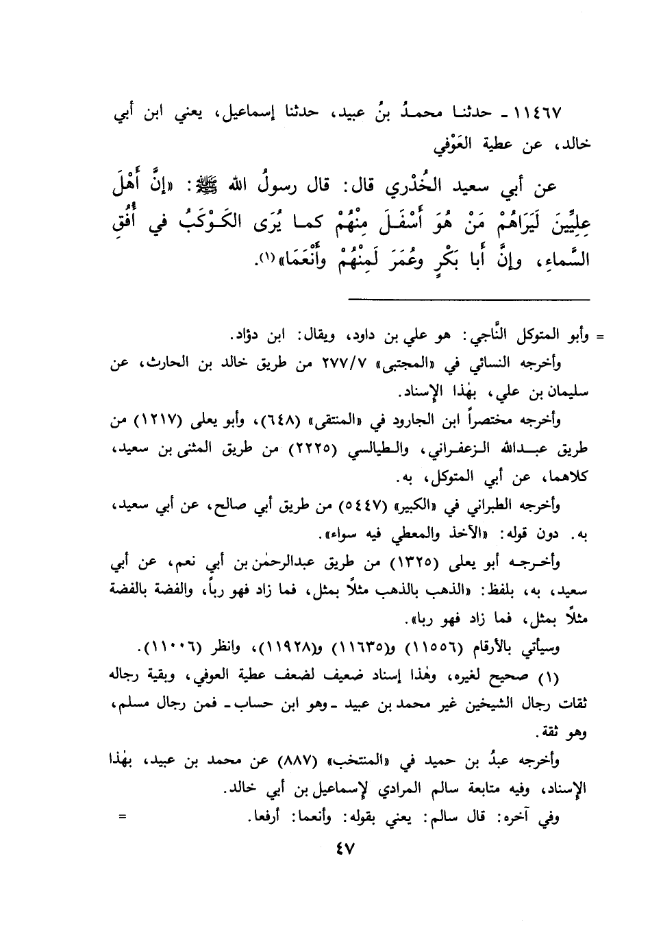 ١١٤٦٧ - حَدَّثَنَا مُحَمَّدُ بْنُ عُبَيْدٍ، حَدَّثَنَا إِسْمَاعِيلُ يَعْنِي ابْنَ أَبِي خَالِدٍ، عَنْ عَطِيَّةَ الْعَوْفِيِّ، عَنْ أَبِي سَعِيدٍ الْخُدْرِيِّ قَالَ: قَالَ رَسُولُ اللهِ صَلَّى اللهُ عَلَيْهِ وَسَلَّمَ: " إِنَّ أَهْلَ عِلِّيِّينَ لَيَرَاهُمْ مَنْ هُوَ أَسْفَلَ مِنْهُمْ، كَمَا يُرَى الْكَوْكَبُ فِي أُفُقِ السَّمَاءِ، وَإِنَّ أَبَا بَكْرٍ وَعُمَرَ لَمِنْهُمْ، وَأَنْعَمَا " (١) ،