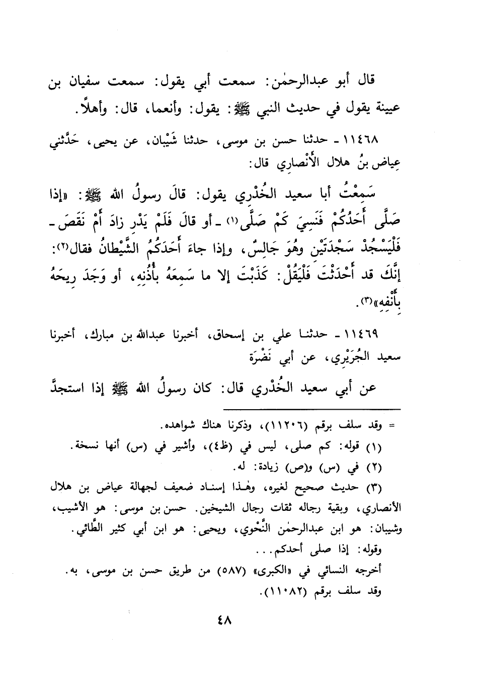 ١١٤٦٨ - حَدَّثَنَا حَسَنُ بْنُ مُوسَى، حَدَّثَنَا شَيْبَانُ، عَنْ يَحْيَى، حَدَّثَنِي عِيَاضُ بْنُ هِلَالٍ الْأَنْصَارِيُّ قَالَ: سَمِعْتُ أَبَا سَعِيدٍ الْخُدْرِيَّ يَقُولُ: قَالَ رَسُولُ اللهِ صَلَّى اللهُ عَلَيْهِ وَسَلَّمَ: " إِذَا صَلَّى أَحَدُكُمْ فَنَسِيَ كَمْ صَلَّى، (١) - أَوْ قَالَ: فَلَمْ يَدْرِ زَادَ أَمْ نَقَصَ -، فَلْيَسْجُدْ سَجْدَتَيْنِ، وَهُوَ جَالِسٌ، وَإِذَا جَاءَ أَحَدَكُمُ الشَّيْطَانُ، فَقَالَ (٢) : إِنَّكَ قَدْ أَحْدَثْتَ، فَلْيَقُلْ: كَذَبْتَ، إِلَّا مَا سَمِعَهُ بِأُذُنِهِ، أَوْ وَجَدَ رِيحَهُ بِأَنْفِهِ " (٣)