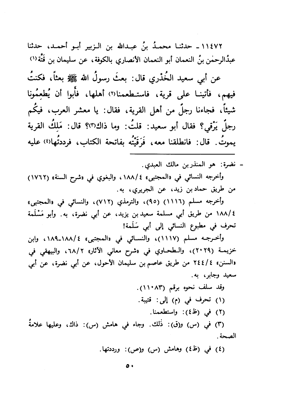 ١١٤٧٢ - حَدَّثَنَا مُحَمَّدُ بْنُ عَبْدِ اللهِ بْنِ الزُّبَيْرِ أَبُو أَحْمَدَ، حَدَّثَنَا عَبْدُ الرَّحْمَنِ بْنُ النُّعْمَانِ أَبُو النُّعْمَانِ الْأَنْصَارِيُّ، بِالْكُوفَةِ، عَنْ سُلَيْمَانَ بْنِ قَتَّةَ، (١) عَنْ أَبِي سَعِيدٍ الْخُدْرِيِّ قَالَ: بَعَثَ رَسُولُ اللهِ صَلَّى اللهُ عَلَيْهِ وَسَلَّمَ بَعْثًا فَكُنْتُ فِيهِمْ، فَأَتَيْنَا عَلَى قَرْيَةٍ، فَاسْتَطْعَمْنَا (٢) أَهْلَهَا، فَأَبَوْا أَنْ يُطْعِمُونَا شَيْئًا، فَجَاءَنَا رَجُلٌ مِنْ أَهْلِ الْقَرْيَةِ، فَقَالَ: يَا مَعْشَرَ الْعَرَبِ فِيكُمْ رَجُلٌ يَرْقِي؟ فَقَالَ أَبُو سَعِيدٍ: قُلْتُ: وَمَا ذَاكَ (٣) ؟ قَالَ: مَلِكُ الْقَرْيَةِ يَمُوتُ. قَالَ: فَانْطَلَقْنَا مَعَهُ فَرَقَيْتُهُ بِفَاتِحَةِ الْكِتَابِ، فَرَدَّدْتُهَا (٤) عَلَيْهِ