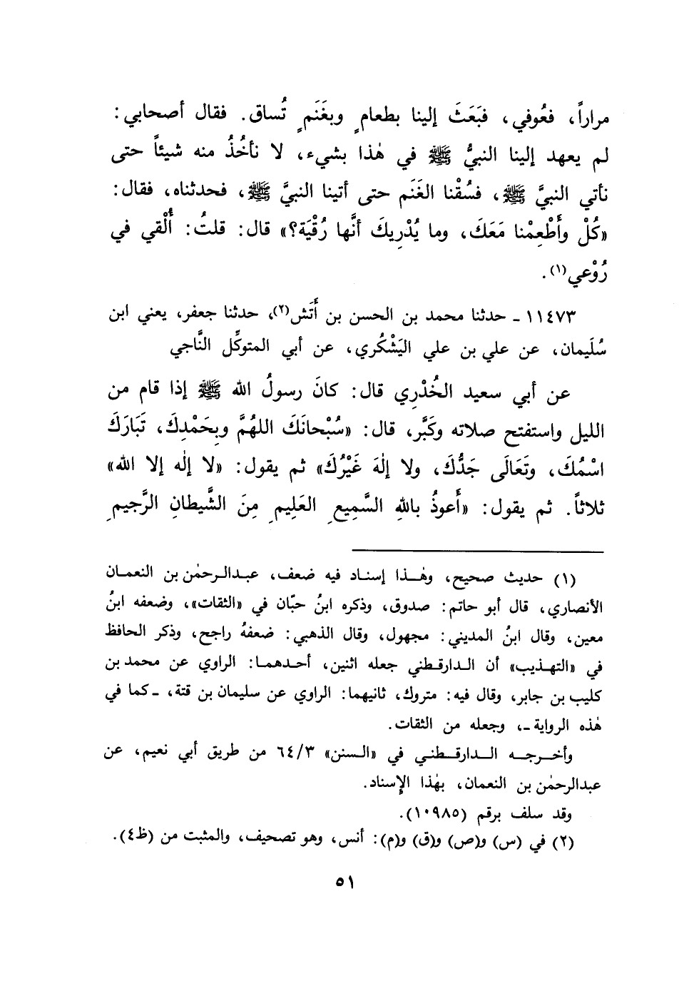 ١١٤٧٣ - حَدَّثَنَا مُحَمَّدُ بْنُ الْحَسَنِ بْنِ أَتْشٍ (٢) ، حَدَّثَنَا جَعْفَرٌ يَعْنِي ابْنَ سُلَيْمَانَ، عَنْ عَلِيِّ بْنِ عَلِيٍّ الْيَشْكُرِيِّ، عَنْ أَبِي الْمُتَوَكِّلِ النَّاجِيِّ، عَنْ أَبِي سَعِيدٍ الْخُدْرِيِّ قَالَ: كَانَ رَسُولُ اللهِ صَلَّى اللهُ عَلَيْهِ وَسَلَّمَ إِذَا قَامَ مِنَ اللَّيْلِ وَاسْتَفْتَحَ صَلَاتَهُ وَكَبَّرَ قَالَ " سُبْحَانَكَ اللهُمَّ وَبِحَمْدِكَ، تَبَارَكَ اسْمُكَ، وَتَعَالَى جَدُّكَ، وَلَا إِلَهَ غَيْرُكَ "، ثُمَّ يَقُولُ: " لَا إِلَهَ إِلَّا اللهُ " ثَلَاثًا، ثُمَّ يَقُولُ: " أَعُوذُ بِاللهِ السَّمِيعِ الْعَلِيمِ، مِنَ الشَّيْطَانِ الرَّجِيمِ،