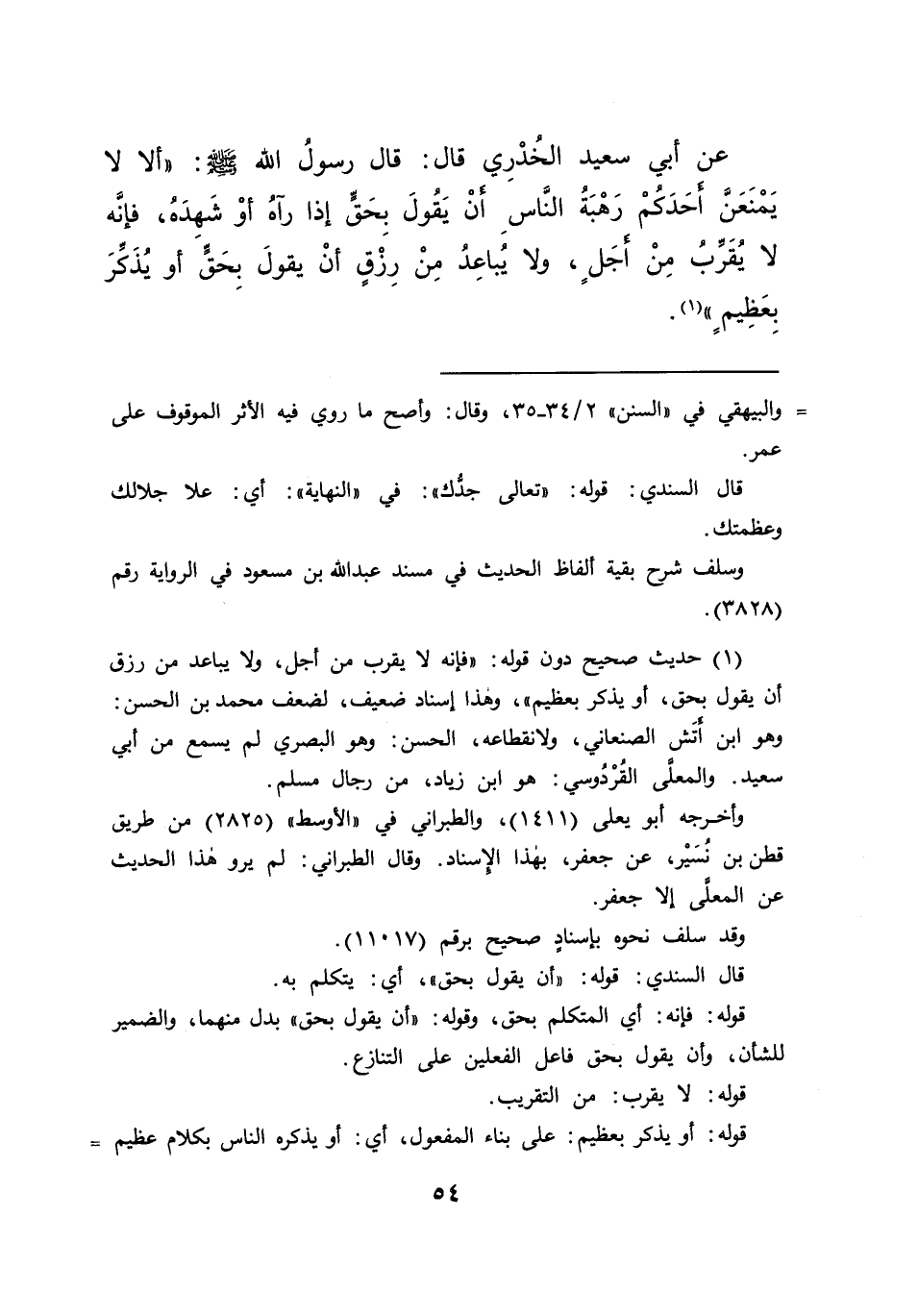 عَنْ أَبِي سَعِيدٍ الْخُدْرِيِّ قَالَ: قَالَ رَسُولُ اللهِ صَلَّى اللهُ عَلَيْهِ وَسَلَّمَ: " أَلَا لَا يَمْنَعَنَّ أَحَدَكُمْ رَهْبَةُ النَّاسِ، أَنْ يَقُولَ بِحَقٍّ إِذَا رَآهُ أَوْ شَهِدَهُ، فَإِنَّهُ لَا يُقَرِّبُ مِنْ أَجَلٍ، وَلَا يُبَاعِدُ مِنْ رِزْقٍ، أَنْ يَقُولَ بِحَقٍّ أَوْ يُذَكِّرَ بِعَظِيمٍ " (١)