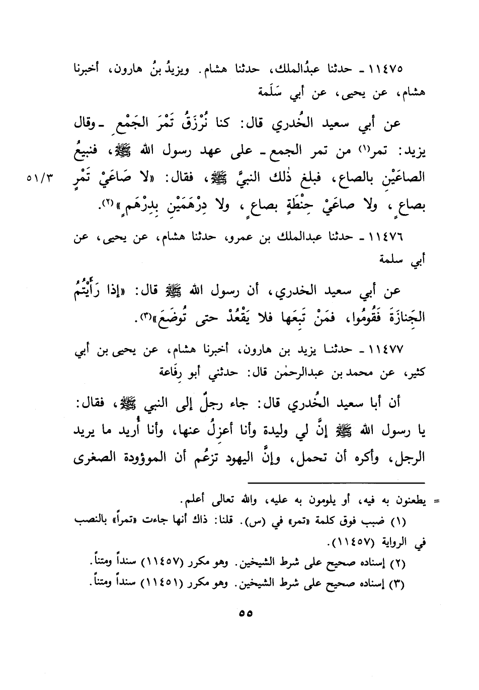 ١١٤٧٥ - حَدَّثَنَا عَبْدُ الْمَلِكِ، حَدَّثَنَا هِشَامٌ، وَيَزِيدُ بْنُ هَارُونَ، أَخْبَرَنَا هِشَامٌ، عَنْ يَحْيَى، عَنْ أَبِي سَلَمَةَ، عَنْ أَبِي سَعِيدٍ الْخُدْرِيِّ قَالَ: كُنَّا نُرْزَقُ تَمْرَ الْجَمْعِ، - وَقَالَ يَزِيدُ: تَمْرٌ (١) مِنْ تَمْرِ الْجَمْعِ - عَلَى عَهْدِ رَسُولِ اللهِ صَلَّى اللهُ عَلَيْهِ وَسَلَّمَ فَنَبِيعُ الصَّاعَيْنِ بِالصَّاعِ، فَبَلَغَ ذَلِكَ النَّبِيَّ صَلَّى اللهُ عَلَيْهِ وَسَلَّمَ فَقَالَ: " لَا صَاعَيْ تَمْرٍ بِصَاعٍ، وَلَا صَاعَيْ حِنْطَةٍ بِصَاعٍ، وَلَا دِرْهَمَيْنِ بِدِرْهَمٍ " (٢)