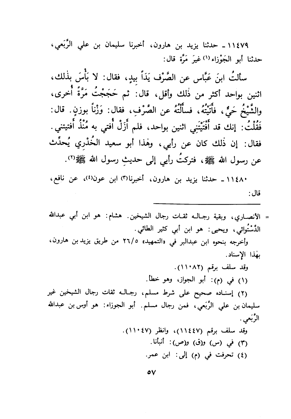 ١١٤٧٩ - حَدَّثَنَا يَزِيدُ بْنُ هَارُونَ، أَخْبَرَنَا سُلَيْمَانُ بْنُ عَلِيٍّ الرَّبْعِيُّ، حَدَّثَنَا أَبُو الْجَوْزَاءِ (١) غَيْرَ مَرَّةٍ، قَالَ: سَأَلْتُ ابْنَ عَبَّاسٍ عَنِ الصَّرْفِ يَدًا بِيَدٍ، فَقَالَ: لَا بَأْسَ بِذَلِكَ اثْنَيْنِ بِوَاحِدٍ أَكْثَرُ مِنْ ذَلِكَ وَأَقَلُّ، قَالَ: ثُمَّ حَجَجْتُ مَرَّةً أُخْرَى، وَالشَّيْخُ حَيٌّ، فَأَتَيْتُهُ فَسَأَلْتُهُ عَنِ الصَّرْفِ، فَقَالَ: " وَزْنًا بِوَزْنٍ " قَالَ: فَقُلْتُ: إِنَّكَ قَدْ أَفْتَيْتَنِي اثْنَيْنِ بِوَاحِدٍ، فَلَمْ أَزَلْ أُفْتِي بِهِ، مُنْذُ أَفْتَيْتَنِي، فَقَالَ: إِنَّ ذَلِكَ كَانَ عَنْ رَأْيِي، وَهَذَا أَبُو سَعِيدٍ الْخُدْرِيُّ يُحَدِّثُ، عَنْ رَسُولِ اللهِ صَلَّى اللهُ عَلَيْهِ وَسَلَّمَ فَتَرَكْتُ رَأْيِي إِلَى حَدِيثِ رَسُولِ اللهِ صَلَّى اللهُ عَلَيْهِ وَسَلَّمَ (٢)