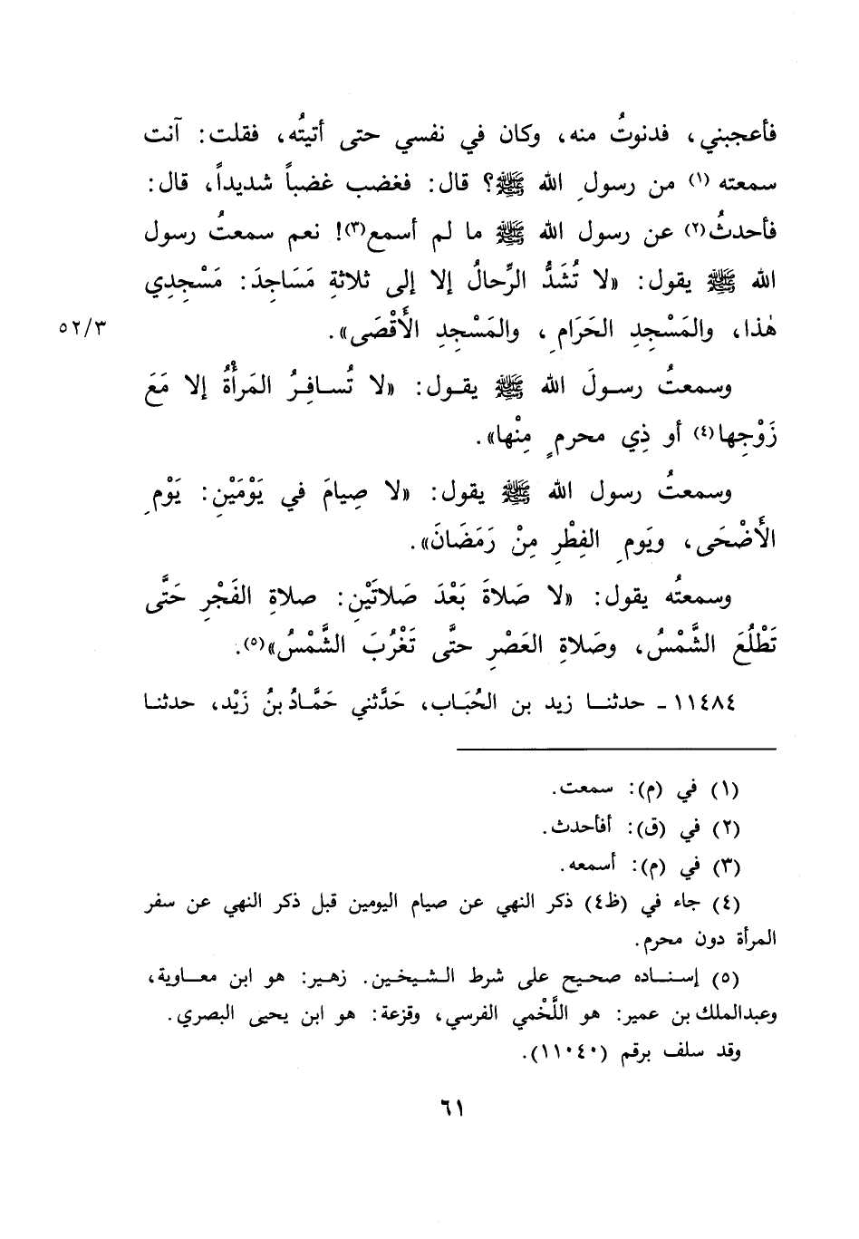 (٤) جاء في (ظ ٤) ذكر النهي عن صيام اليومين قبل ذكر النهي عن سفر المرأة دون محرم.