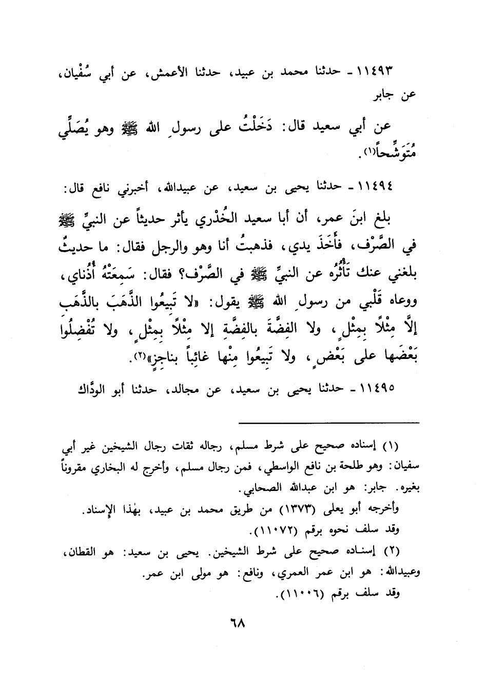 ١١٤٩٤ - حَدَّثَنَا يَحْيَى بْنُ سَعِيدٍ، عَنْ عُبَيْدِ اللهِ، أَخْبَرَنِي نَافِعٌ، قَالَ: بَلَغَ ابْنَ عُمَرَ، أَنَّ أَبَا سَعِيدٍ الْخُدْرِيَّ يَأْثُرُ حَدِيثًا عَنِ النَّبِيِّ صَلَّى اللهُ عَلَيْهِ وَسَلَّمَ فِي الصَّرْفِ؟ فَأَخَذَ يَدِي، فَذَهَبْتُ أَنَا وَهُوَ وَالرَّجُلُ، فَقَالَ: مَا حَدِيثٌ بَلَغَنِي عَنْكَ تَأْثُرُهُ عَنِ النَّبِيِّ صَلَّى اللهُ عَلَيْهِ وَسَلَّمَ فِي الصَّرْفِ؟ فَقَالَ: سَمِعَتْهُ أُذُنَايَ، وَوَعَاهُ قَلْبِي مِنْ رَسُولِ اللهِ صَلَّى اللهُ عَلَيْهِ وَسَلَّمَ يَقُولُ: " لَا تَبِيعُوا الذَّهَبَ بِالذَّهَبِ، إِلَّا مِثْلًا بِمِثْلٍ، وَلَا الْفِضَّةَ بِالْفِضَّةِ، إِلَّا مِثْلًا بِمِثْلٍ، وَلَا تُفَضِّلُوا بَعْضَهَا عَلَى بَعْضٍ، وَلَا تَبِيعُوا مِنْهَا غَائِبًا بِنَاجِزٍ " (٢)