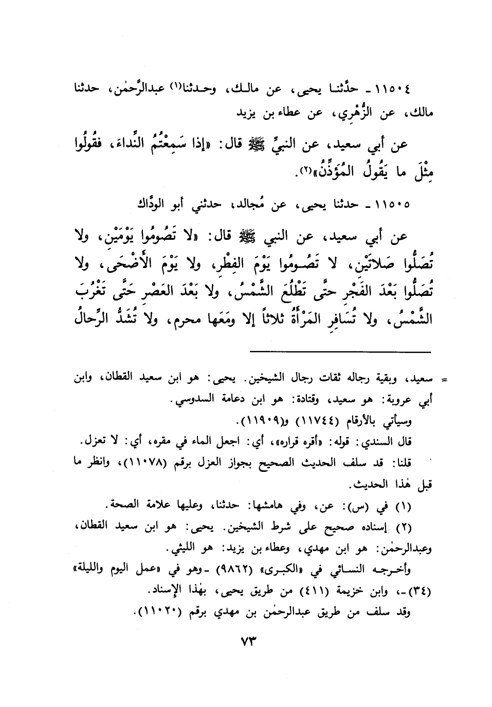 ١١٥٠٥ - حَدَّثَنَا يَحْيَى، عَنْ مُجَالِدٍ، حَدَّثَنِي أَبُو الْوَدَّاكِ، عَنْ أَبِي سَعِيدٍ، عَنِ النَّبِيِّ صَلَّى اللهُ عَلَيْهِ وَسَلَّمَ قَالَ: " لَا تَصُومُوا يَوْمَيْنِ، وَلَا تُصَلُّوا صَلَاتَيْنِ، وَلَا تَصُومُوا يَوْمَ الْفِطْرِ وَلَا يَوْمَ الْأَضْحَى، وَلَا تُصَلُّوا بَعْدَ الْفَجْرِ حَتَّى تَطْلُعَ الشَّمْسُ، وَلَا بَعْدَ الْعَصْرِ حَتَّى تَغْرُبَ الشَّمْسُ "