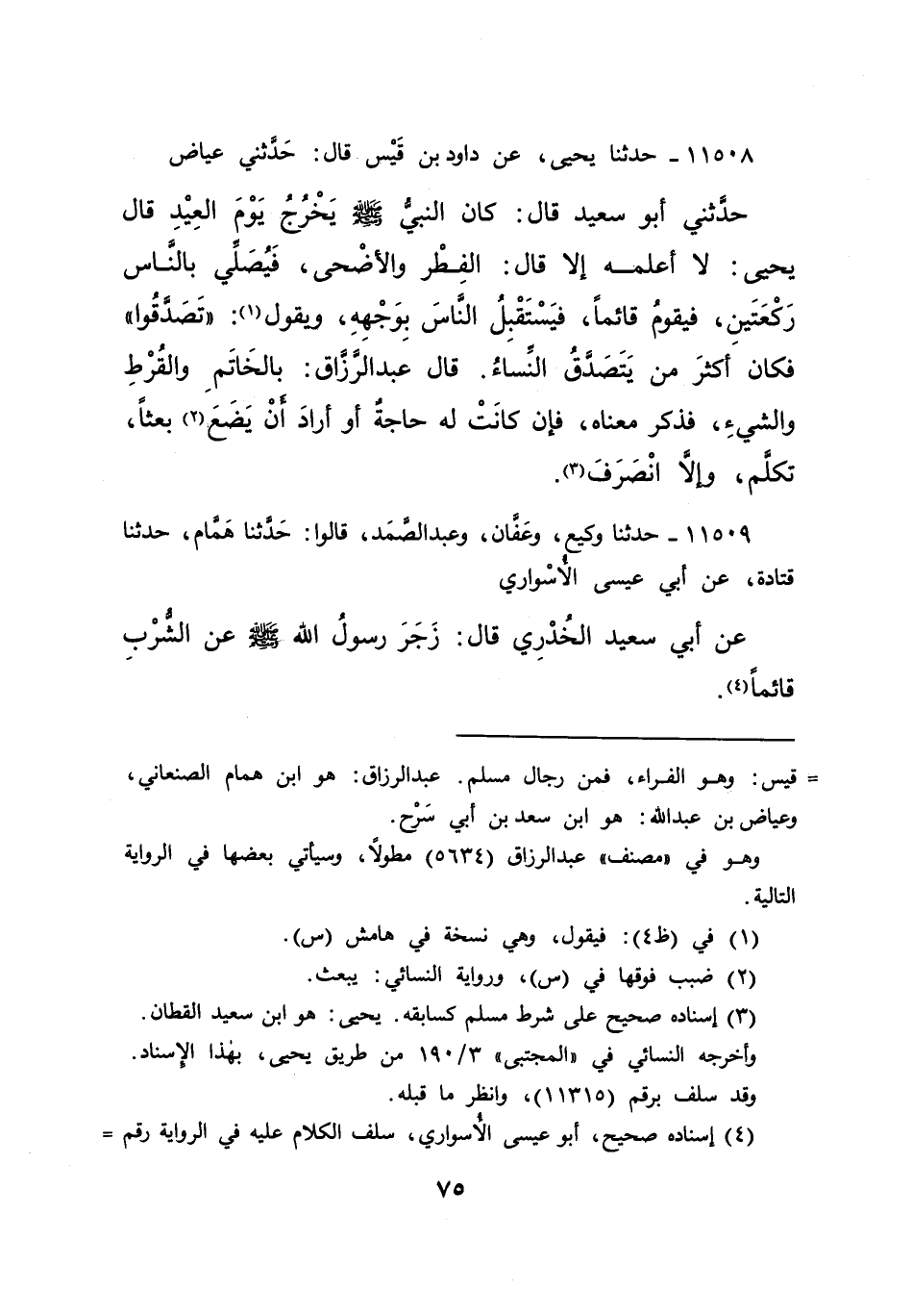 ١١٥٠٨ - حَدَّثَنَا يَحْيَى، عَنْ دَاوُدَ بْنِ قَيْسٍ قَالَ: حَدَّثَنِي عِيَاضٌ، حَدَّثَنِي أَبُو سَعِيدٍ قَالَ: كَانَ النَّبِيُّ صَلَّى اللهُ عَلَيْهِ وَسَلَّمَ يَخْرُجُ يَوْمَ الْعِيدِ، - قَالَ يَحْيَى: لَا أَعْلَمُهُ إِلَّا قَالَ الْفِطْرِ وَالْأَضْحَى - فَيُصَلِّي بِالنَّاسِ رَكْعَتَيْنِ، فَيَقُومُ قَائِمًا، فَيَسْتَقْبِلُ النَّاسَ بِوَجْهِهِ وَيَقُولُ (١) : " تَصَدَّقُوا " فَكَانَ أَكْثَرَ مَنْ يَتَصَدَّقُ النِّسَاءُ قَالَ عَبْدُ الرَّزَّاقِ: بِالْخَاتَمِ وَالْقُرْطِ وَالشَّيْءِ فَذَكَرَ مَعْنَاهُ، فَإِنْ كَانَتْ لَهُ حَاجَةٌ، أَوْ أَرَادَ أَنْ يَضَعَ (٣) بَعْثًا، تَكَلَّمَ، وَإِلَّا انْصَرَفَ (٣)