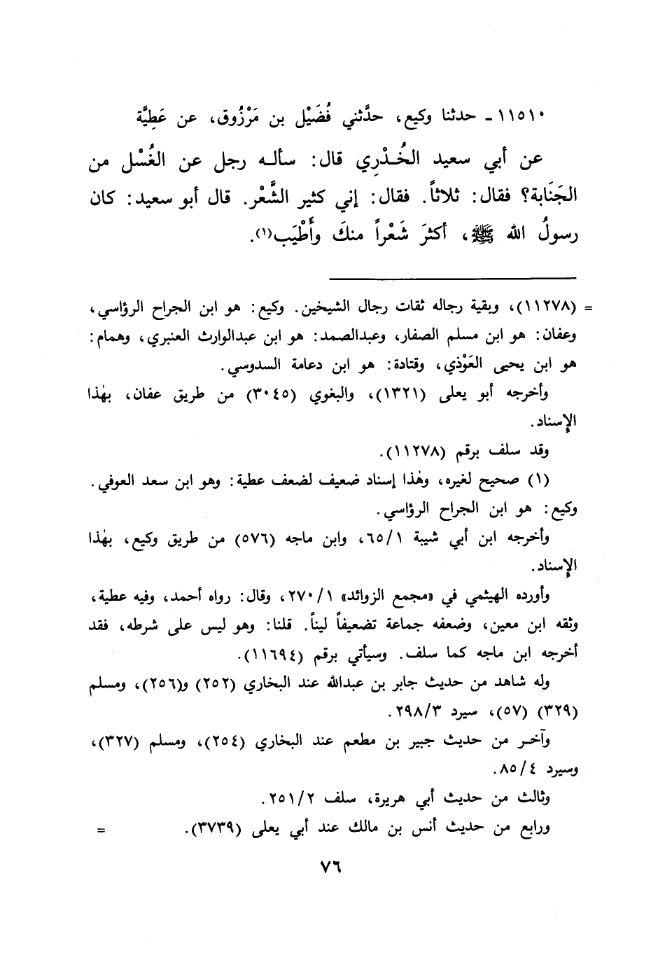 ١١٥١٠ - حَدَّثَنَا وَكِيعٌ، حَدَّثَنِي فُضَيْلُ بْنُ مَرْزُوقٍ، عَنْ عَطِيَّةَ، عَنْ أَبِي سَعِيدٍ الْخُدْرِيِّ قَالَ: سَأَلَهُ رَجُلٌ عَنِ الْغُسْلِ مِنَ الْجَنَابَةِ، فَقَالَ: " ثَلَاثًا "، فَقَالَ: إِنِّي كَثِيرُ الشَّعَرِ. قَالَ أَبُو سَعِيدٍ: " كَانَ رَسُولُ اللهِ صَلَّى اللهُ عَلَيْهِ وَسَلَّمَ أَكْثَرَ شَعَرًا مِنْكَ وَأَطْيَبَ " (١)
