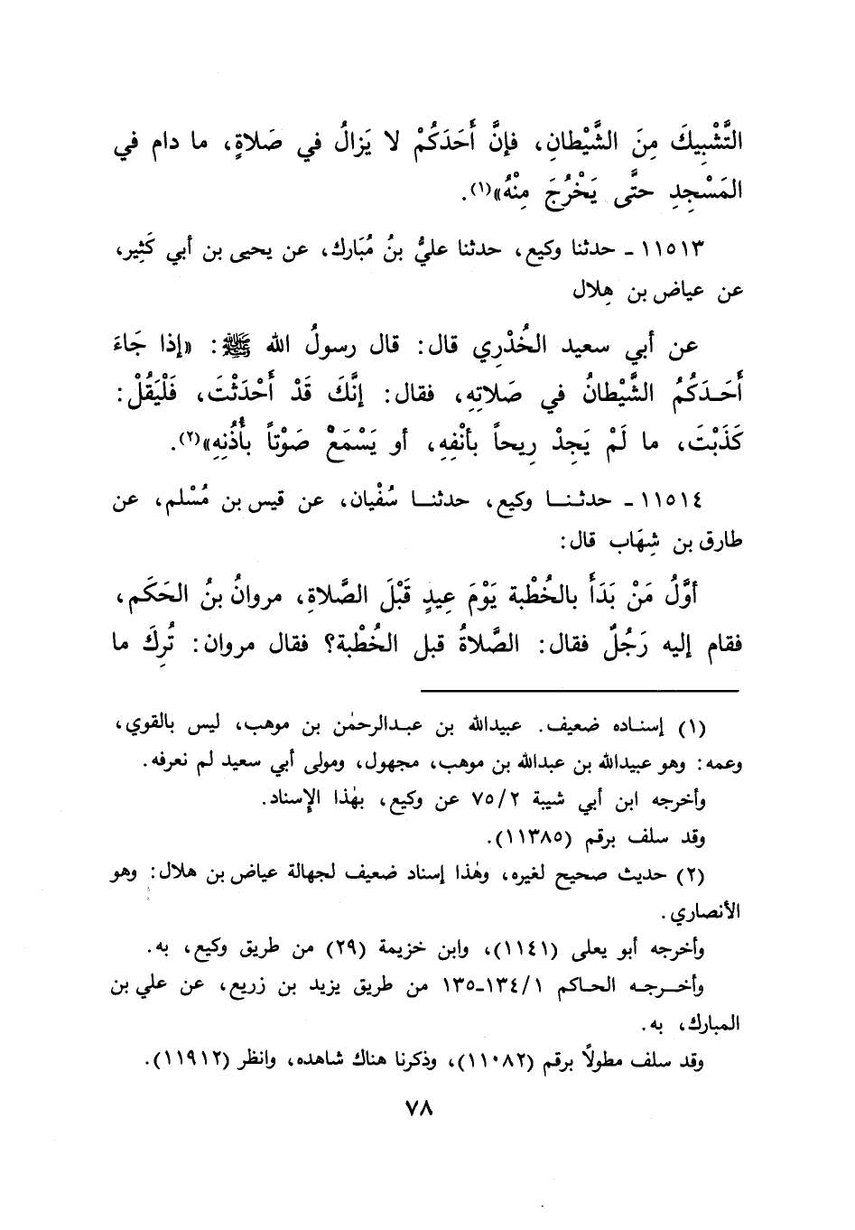 ١١٥١٣ - حَدَّثَنَا وَكِيعٌ، حَدَّثَنَا عَلِيُّ بْنُ مُبَارَكٍ، عَنْ يَحْيَى بْنِ أَبِي كَثِيرٍ، عَنْ عِيَاضِ بْنِ هِلَالٍ، عَنْ أَبِي سَعِيدٍ الْخُدْرِيِّ قَالَ: قَالَ رَسُولُ اللهِ صَلَّى اللهُ عَلَيْهِ وَسَلَّمَ: " إِذَا جَاءَ أَحَدَكُمُ الشَّيْطَانُ فِي صَلَاتِهِ، فَقَالَ: إِنَّكَ قَدْ أَحْدَثْتَ فَلْيَقُلْ: كَذَبْتَ، مَا لَمْ يَجِدْ رِيحًا بِأَنْفِهِ، أَوْ يَسْمَعْ صَوْتًا بِأُذُنِهِ " (٢)