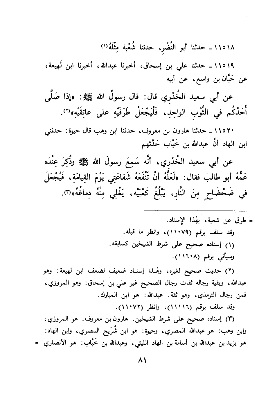 ١١٥٢٠ - حَدَّثَنَا هَارُونُ بْنُ مَعْرُوفٍ، حَدَّثَنَا ابْنُ وَهْبٍ، قَالَ حَيْوَةُ: حَدَّثَنِي ابْنُ الْهَادِ، أَنَّ عَبْدَ اللهِ بْنَ خَبَّابٍ، حَدَّثَهُمْ، عَنْ أَبِي سَعِيدٍ الْخُدْرِيِّ أَنَّهُ سَمِعَ رَسُولَ اللهِ صَلَّى اللهُ عَلَيْهِ وَسَلَّمَ وَذُكِرَ عِنْدَهُ عَمُّهُ أَبُو طَالِبٍ فَقَالَ: " لَعَلَّهُ أَنْ تَنْفَعَهُ شَفَاعَتِي يَوْمَ الْقِيَامَةِ، فَيُجْعَلَ فِي ضَحْضَاحٍ مِنَ النَّارِ، يَبْلُغُ كَعْبَيْهِ يَغْلِي مِنْهُ دِمَاغُهُ " (٣)
