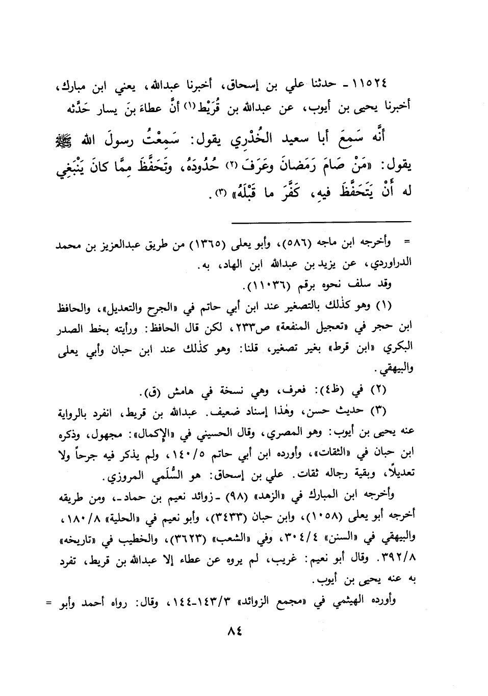 ١١٥٢٤ - حَدَّثَنَا عَلِيُّ بْنُ إِسْحَاقَ، أَخْبَرَنَا عَبْدُ اللهِ يَعْنِي ابْنَ مُبَارَكٍ، أَخْبَرَنَا يَحْيَى بْنُ أَيُّوبَ، عَنْ عَبْدِ اللهِ بْنِ قُرَيْطٍ (١) ، أَنَّ عَطَاءَ بْنَ يَسَارٍ، حَدَّثَهُ أَنَّهُ، سَمِعَ أَبَا سَعِيدٍ الْخُدْرِيَّ يَقُولُ: سَمِعْتُ رَسُولَ اللهِ صَلَّى اللهُ عَلَيْهِ وَسَلَّمَ يَقُولُ: " مَنْ صَامَ رَمَضَانَ، وَعَرَفَ (٢) حُدُودَهُ، وَتَحَفَّظَ مِمَّا كَانَ يَنْبَغِي لَهُ أَنْ يَتَحَفَّظَ فِيهِ، كَفَّرَ مَا قَبْلَهُ " (٣)