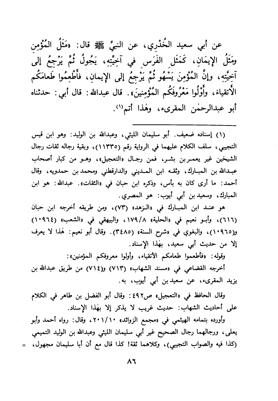عَنْ أَبِي سَعِيدٍ الْخُدْرِيِّ، عَنِ النَّبِيِّ صَلَّى اللهُ عَلَيْهِ وَسَلَّمَ قَالَ: " مَثَلُ الْمُؤْمِنِ وَمَثَلُ الْإِيمَانِ، كَمَثَلِ الْفَرَسِ فِي آخِيَّتِهِ يَجُولُ، ثُمَّ يَرْجِعُ إِلَى آخِيَّتِهِ، وَإِنَّ الْمُؤْمِنَ يَسْهُو، ثُمَّ يَرْجِعُ إِلَى الْإِيمَانِ، فَأَطْعِمُوا طَعَامَكُمُ الْأَتْقِيَاءَ، وَأَوْلُوا مَعْرُوفَكُمُ الْمُؤْمِنِينَ "، قَالَ عَبْدُ اللهِ: قَالَ أَبِي: حَدَّثَنَاهُ أَبُو عَبْدِ الرَّحْمَنِ الْمُقْرِئُ " وَهَذَا أَتَمُّ " (١)