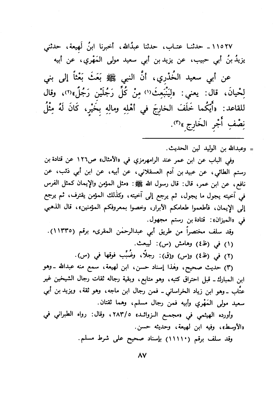 ١١٥٢٧ - حَدَّثَنَا عَتَّابٌ، حَدَّثَنَا عَبْدُ اللهِ، أَخْبَرَنَا ابْنُ لَهِيعَةَ، حَدَّثَنِي يَزِيدُ بْنُ أَبِي حَبِيبٍ، عَنْ يَزِيدَ بْنِ أَبِي سَعِيدٍ، مَوْلَى الْمَهْرِيِّ، عَنْ أَبِيهِ، عَنْ أَبِي سَعِيدٍ الْخُدْرِيِّ أَنَّ النَّبِيَّ صَلَّى اللهُ عَلَيْهِ وَسَلَّمَ بَعَثَ بَعْثًا إِلَى بَنِي لِحْيَانَ، - قَالَ: يَعْنِي: لِيَنْبَعِثْ (١) مِنْ كُلِّ رَجُلَيْنِ رَجُلٌ - وَقَالَ لِلْقَاعِدِ: " أَيُّكُمَا خَلَفَ الْخَارِجَ فِي أَهْلِهِ وَمَالِهِ بِخَيْرٍ، كَانَ لَهُ مِثْلُ نِصْفِ أَجْرِ الْخَارِجِ " (٢)