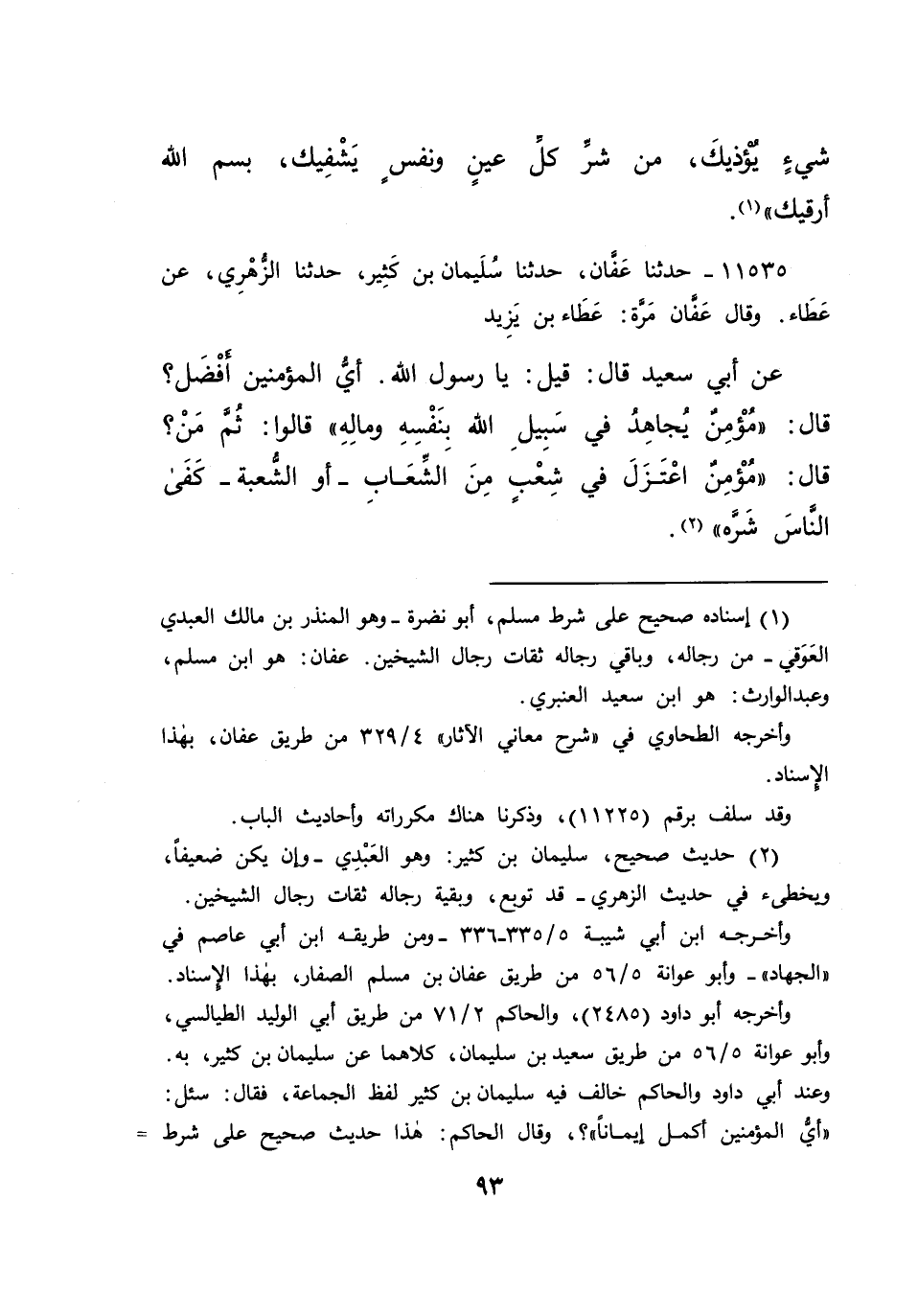 ١١٥٣٥ - حَدَّثَنَا عَفَّانُ، حَدَّثَنَا سُلَيْمَانُ بْنُ كَثِيرٍ، حَدَّثَنَا الزُّهْرِيُّ، عَنْ عَطَاءٍ، وَقَالَ عَفَّانُ مَرَّةً: عَطَاءُ بْنُ يَزِيدَ، عَنْ أَبِي سَعِيدٍ قَالَ: قِيلَ يَا رَسُولَ اللهِ: أَيُّ الْمُؤْمِنِينَ أَفْضَلُ؟ قَالَ: " مُؤْمِنٌ يُجَاهِدُ فِي سَبِيلِ اللهِ بِنَفْسِهِ، وَمَالِهِ "، قَالُوا: ثُمَّ مَنْ؟ قَالَ: " مُؤْمِنٌ اعْتَزَلَ فِي شِعْبٍ مِنَ الشِّعَابِ، أَوِ الشُّعْبَةِ كَفَى النَّاسَ شَرَّهُ " (٢)