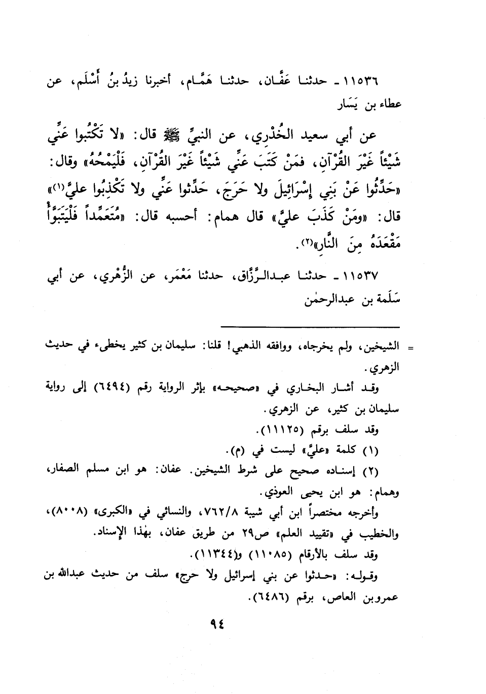 ١١٥٣٦ - حَدَّثَنَا عَفَّانُ، حَدَّثَنَا هَمَّامٌ، أَخْبَرَنَا زَيْدُ بْنُ أَسْلَمَ، عَنْ عَطَاءِ بْنِ يَسَارٍ، عَنْ أَبِي سَعِيدٍ الْخُدْرِيِّ، عَنِ النَّبِيِّ صَلَّى اللهُ عَلَيْهِ وَسَلَّمَ قَالَ: " لَا تَكْتُبُوا عَنِّي شَيْئًا غَيْرَ الْقُرْآنِ، فَمَنْ كَتَبَ عَنِّي شَيْئًا غَيْرَ الْقُرْآنِ، فَلْيَمْحُهُ "
