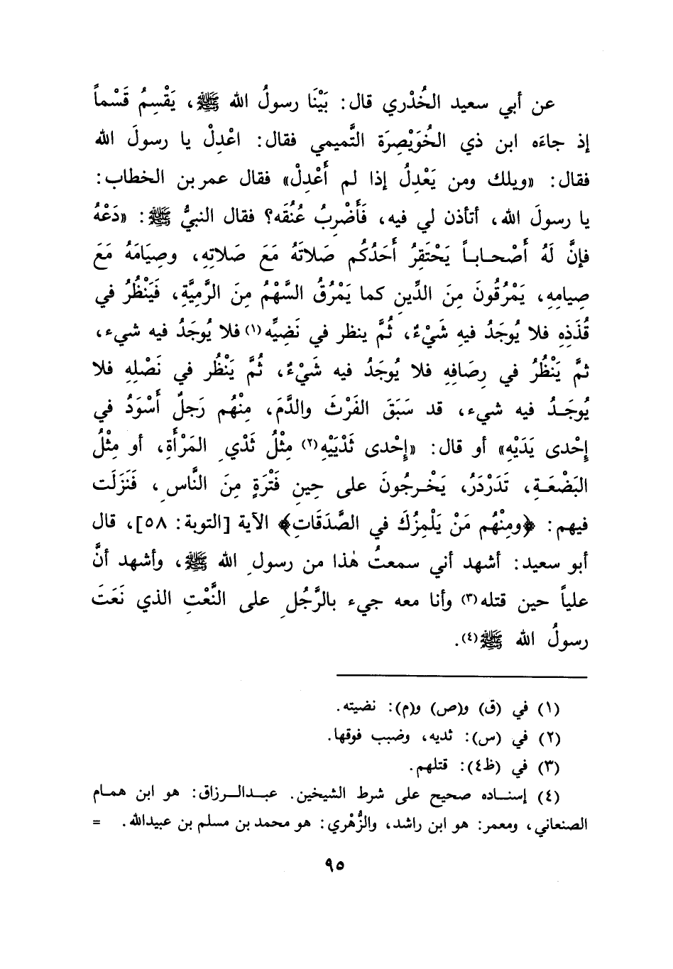 عَنْ أَبِي سَعِيدٍ الْخُدْرِيِّ قَالَ: بَيْنَا رَسُولُ اللهِ صَلَّى اللهُ عَلَيْهِ وَسَلَّمَ يَقْسِمُ قِسْمًا، إِذْ جَاءَهُ ابْنُ ذِي الْخُوَيْصِرَةِ التَّمِيمِيُّ فَقَالَ: اعْدِلْ يَا رَسُولَ اللهِ، فَقَالَ: " وَيْلَكَ وَمَنْ يَعْدِلُ إِذَا لَمْ أَعْدِلْ؟ "، فَقَالَ عُمَرُ بْنُ الْخَطَّابِ: يَا رَسُولَ اللهِ، أَتَأْذَنُ لِي فِيهِ فَأَضْرِبَ عُنُقَهُ؟ فَقَالَ النَّبِيُّ صَلَّى اللهُ عَلَيْهِ وَسَلَّمَ: " دَعْهُ فَإِنَّ لَهُ أَصْحَابًا يَحْتَقِرُ أَحَدُكُمْ صَلَاتَهُ مَعَ صَلَاتِهِ، وَصِيَامَهُ مَعَ صِيَامِهِ، يَمْرُقُونَ مِنَ الدِّينِ، كَمَا يَمْرُقُ السَّهْمُ مِنَ الرَّمِيَّةِ، فَيُنْظَرُ فِي قُذَذِهِ فَلَا يُوجَدُ فِيهِ شَيْءٌ، ثُمَّ يُنْظَرُ فِي نَضِيِّهِ (١) فَلَا يُوجَدُ فِيهِ شَيْءٌ، ثُمَّ يُنْظَرُ فِي رِصَافِهِ فَلَا يُوجَدُ فِيهِ شَيْءٌ، ثُمَّ يُنْظَرُ فِي نَصْلِهِ، فَلَا يُوجَدُ فِيهِ شَيْءٌ، قَدْ سَبَقَ الْفَرْثَ وَالدَّمَ، مِنْهُمْ رَجُلٌ أَسْوَدُ فِي إِحْدَى يَدَيْهِ "، أَوْ قَالَ: " إِحْدَى ثَدْيَيْهِ (٢) مِثْلُ ثَدْيِ الْمَرْأَةِ، أَوْ مِثْلُ الْبَضْعَةِ تَدَرْدَرُ، يَخْرُجُونَ عَلَى حِينِ فَتْرَةٍ مِنَ النَّاسِ، فَنَزَلَتْ فِيهِمْ: {وَمِنْهُمْ مَنْ يَلْمِزُكَ فِي الصَّدَقَاتِ} [التوبة: ٥٨] الْآيَةَ قَالَ أَبُو سَعِيدٍ: " أَشْهَدُ أَنِّي سَمِعْتُ هَذَا مِنْ رَسُولِ اللهِ صَلَّى اللهُ عَلَيْهِ وَسَلَّمَ، وَأَشْهَدُ أَنَّ عَلِيًّا حِينَ قَتَلَهُ (٣) وَأَنَا مَعَهُ، جِيءَ بِالرَّجُلِ عَلَى النَّعْتِ الَّذِي نَعَتَ رَسُولُ اللهِ صَلَّى اللهُ عَلَيْهِ وَسَلَّمَ " (٤)
