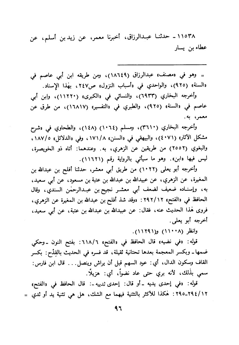 قوله: "في إحدى يديه -أو قال: إحدى ثدييه-: قال الحافظ في "الفتح" ١٢/٢٩٤-٢٩٥: هكذا للأكثر بالتثنية فيهما مع الشك، هل هي تثنية يد أو ثدي =