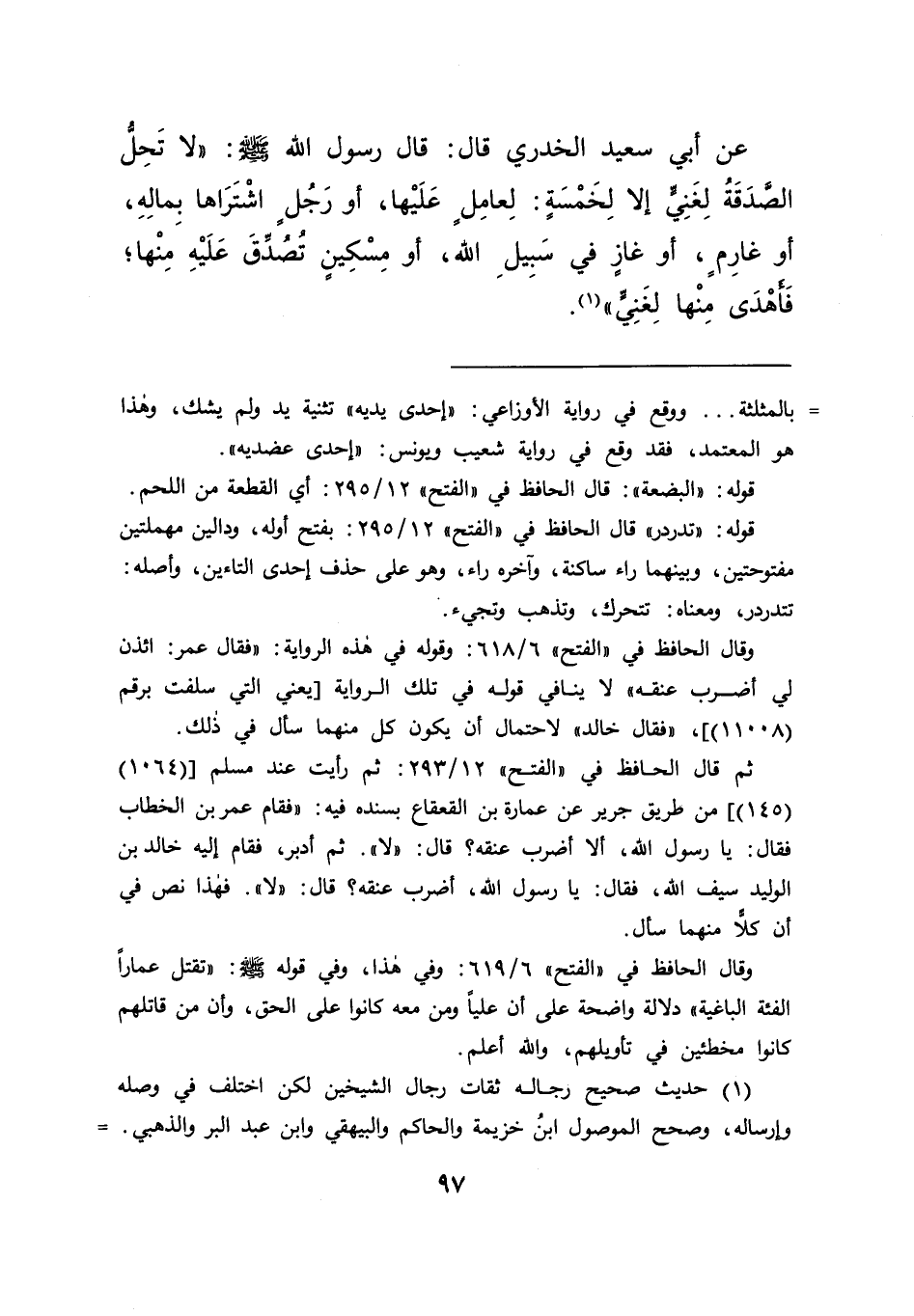عَنْ أَبِي سَعِيدٍ الْخُدْرِيِّ قَالَ: قَالَ رَسُولُ اللهِ صَلَّى اللهُ عَلَيْهِ وَسَلَّمَ: " لَا تَحِلُّ الصَّدَقَةُ لِغَنِيٍّ إِلَّا لِخَمْسَةٍ: لِعَامِلٍ عَلَيْهَا، أَوْ رَجُلٍ اشْتَرَاهَا بِمَالِهِ، أَوْ غَارِمٍ، أَوْ غَازٍ فِي سَبِيلِ اللهِ، أَوْ مِسْكِينٍ تُصُدِّقَ عَلَيْهِ مِنْهَا، فَأَهْدَى مِنْهَا لِغَنِيٍّ " (١)
