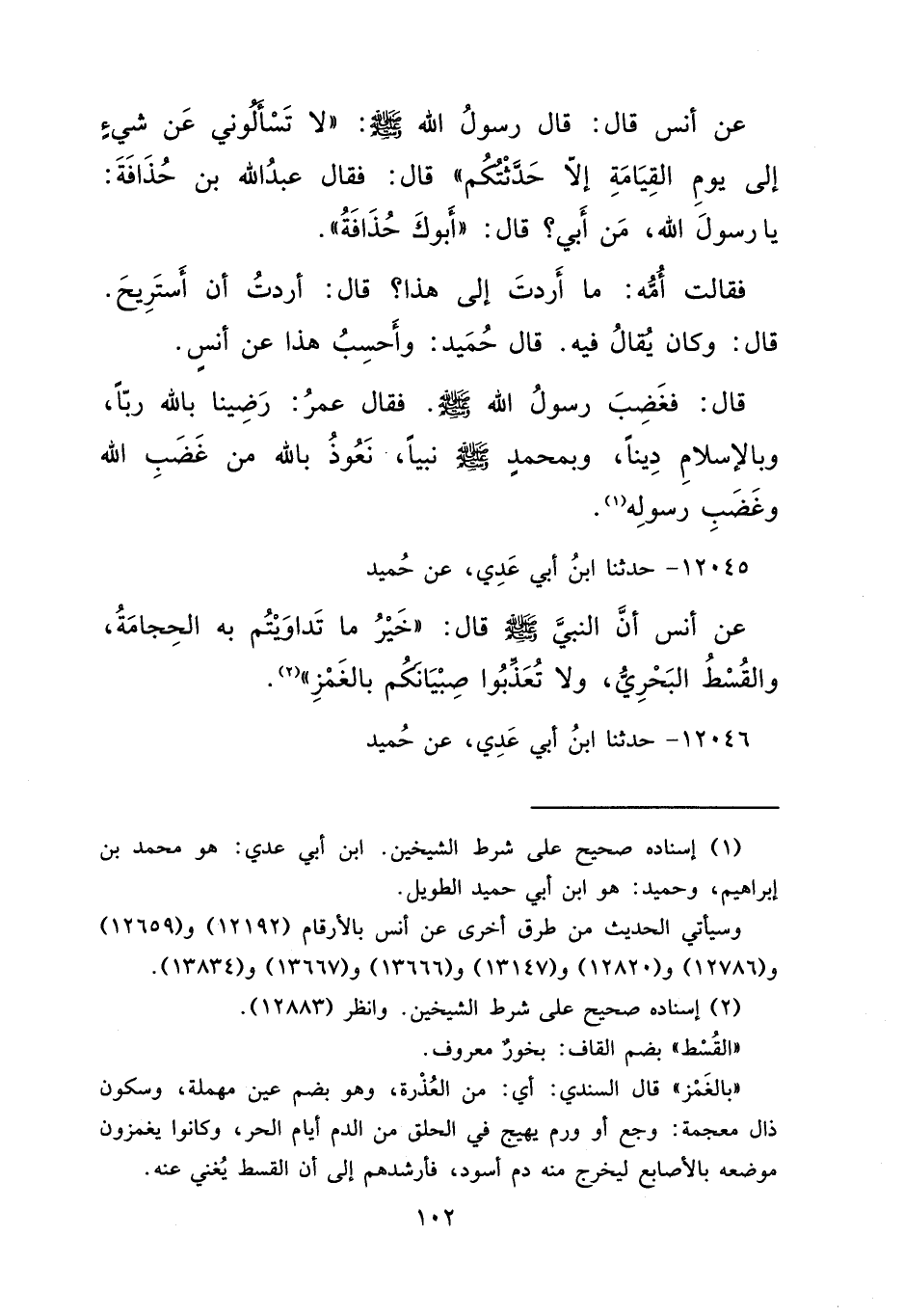 عَنْ أَنَسٍ قَالَ: قَالَ رَسُولُ اللهِ صَلَّى اللهُ عَلَيْهِ وَسَلَّمَ: " لَا تَسْأَلُونِي عَنْ شَيْءٍ إِلَى يَوْمِ الْقِيَامَةِ إِلَّا حَدَّثْتُكُمْ " قَالَ: فَقَالَ عَبْدُ اللهِ بْنُ حُذَافَةَ: يَا رَسُولَ اللهِ، مَنْ أَبِي؟ قَالَ: " أَبُوكَ حُذَافَةُ " فَقَالَتْ أُمُّهُ: مَا أَرَدْتَ إِلَى هَذَا؟ قَالَ: أَرَدْتُ أَنْ أَسْتَرِيحَ، قَالَ: وَكَانَ يُقَالُ فِيهِ، قَالَ حُمَيْدٌ: وَأَحْسَبُ هَذَا عَنْ أَنَسٍ، قَالَ: فَغَضِبَ رَسُولُ اللهِ صَلَّى اللهُ عَلَيْهِ وَسَلَّمَ، فَقَالَ عُمَرُ: رَضِينَا بِاللهِ رَبًّا، وَبِالْإِسْلَامِ دِينًا، وَبِمُحَمَّدٍ صَلَّى اللهُ عَلَيْهِ وَسَلَّمَ نَبِيًّا، نَعُوذُ بِاللهِ مِنْ غَضِبِ اللهِ، وَغَضِبِ رَسُولِهِ (١)