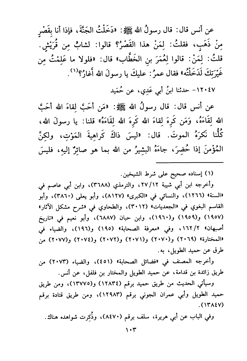 ١٢٠٤٧ - حَدَّثَنَا ابْنُ أَبِي عَدِيٍّ، عَنْ حُمَيْدٍ، عَنْ أَنَسٍ قَالَ: قَالَ رَسُولُ اللهِ صَلَّى اللهُ عَلَيْهِ وَسَلَّمَ: " مَنْ أَحَبَّ لِقَاءَ اللهِ، أَحَبَّ اللهُ لِقَاءَهُ، وَمَنْ كَرِهَ لِقَاءَ اللهِ، كَرِهَ اللهُ لِقَاءَهُ "، قُلْنَا: يَا رَسُولَ اللهِ، كُلُّنَا نَكْرَهُ الْمَوْتَ. قَالَ: " لَيْسَ ذَاكَ كَرَاهِيَةَ الْمَوْتِ، وَلَكِنَّ الْمُؤْمِنَ إِذَا حُضِرَ جَاءَهُ الْبَشِيرُ مِنَ اللهِ، بِمَا هُوَ صَائِرٌ إِلَيْهِ، فَلَيْسَ