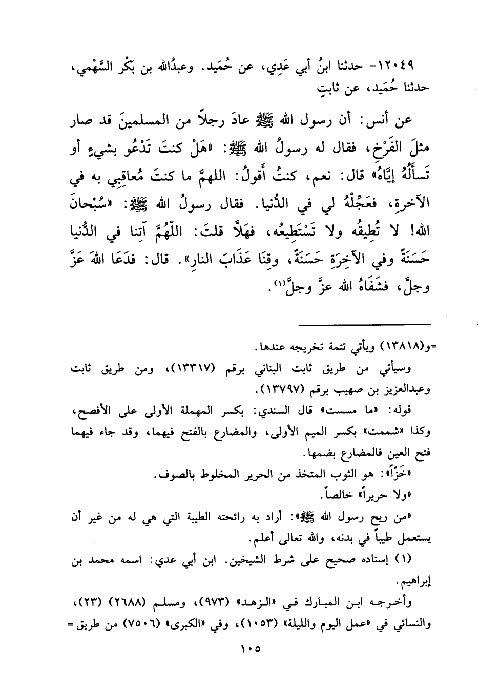 ١٢٠٤٩ - حَدَّثَنَا ابْنُ أَبِي عَدِيٍّ، عَنْ حُمَيْدٍ، وَعَبْدُ اللهِ بْنُ بَكْرٍ السَّهْمِيُّ، حَدَّثَنَا حُمَيْدٌ، عَنْ ثَابِتٍ، عَنْ أَنَسٍ، أَنَّ رَسُولَ اللهِ صَلَّى اللهُ عَلَيْهِ وَسَلَّمَ عَادَ رَجُلًا مِنَ الْمُسْلِمِينَ قَدْ صَارَ مِثْلَ الْفَرْخِ، فَقَالَ لَهُ رَسُولُ اللهِ صَلَّى اللهُ عَلَيْهِ وَسَلَّمَ: " هَلْ كُنْتَ تَدْعُو بِشَيْءٍ، أَوْ تَسْأَلُهُ إِيَّاهُ؟ " قَالَ: نَعَمْ. كُنْتُ أَقُولُ: اللهُمَّ مَا كُنْتَ مُعَاقِبِي بِهِ فِي الْآخِرَةِ فَعَجِّلْهُ لِي فِي الدُّنْيَا. فَقَالَ رَسُولُ اللهِ صَلَّى اللهُ عَلَيْهِ وَسَلَّمَ: " سُبْحَانَ اللهِ لَا تُطِيقُهُ، وَلَا تَسْتَطِيعُهُ، فَهَلَّا قُلْتَ اللهُمَّ آتِنَا فِي الدُّنْيَا حَسَنَةً، وَفِي الْآخِرَةِ حَسَنَةً، وَقِنَا عَذَابَ النَّارِ " قَالَ: " فَدَعَا اللهَ عَزَّ وَجَلَّ، فَشَفَاهُ اللهُ عَزَّ وَجَلَّ (١)