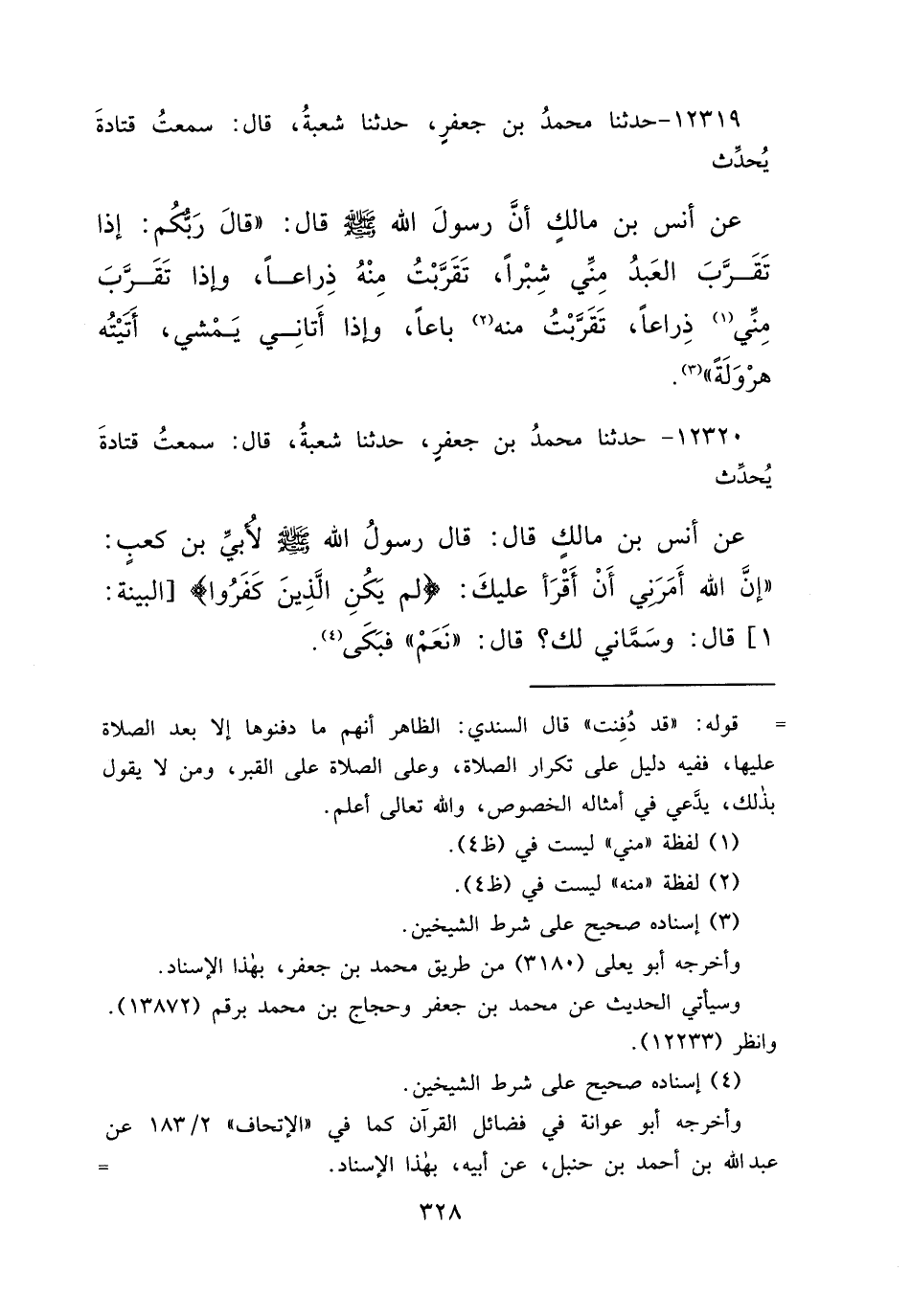 ١٢٣١٩ - حَدَّثَنَا مُحَمَّدُ بْنُ جَعْفَرٍ، حَدَّثَنَا شُعْبَةُ قَالَ: سَمِعْتُ قَتَادَةَ يُحَدِّثُ، عَنْ أَنَسِ بْنِ مَالِكٍ، أَنَّ رَسُولَ اللهِ صَلَّى اللهُ عَلَيْهِ وَسَلَّمَ قَالَ: " قَالَ رَبُّكُمْ: إِذَا تَقَرَّبَ الْعَبْدُ مِنِّي شِبْرًا، تَقَرَّبْتُ مِنْهُ ذِرَاعًا، وَإِذَا تَقَرَّبَ مِنِّي (١) ذِرَاعًا، تَقَرَّبْتُ مِنْهُ (٢) بَاعًا، وَإِذَا أَتَانِي يَمْشِي، أَتَيْتُهُ هَرْوَلَةً " (٣)