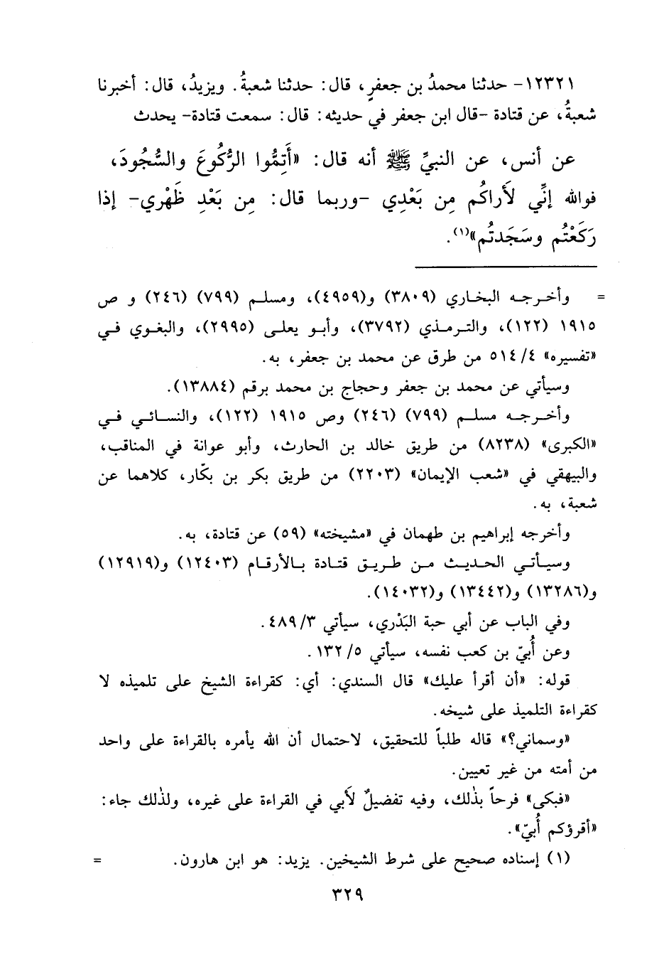 ١٢٣٢١ - حَدَّثَنَا مُحَمَّدُ بْنُ جَعْفَرٍ قَالَ: حَدَّثَنَا شُعْبَةُ، وَيَزِيدُ قَالَ: أَخْبَرَنَا شُعْبَةُ، عَنْ قَتَادَةَ، قَالَ ابْنُ جَعْفَرٍ: فِي حَدِيثِهِ قَالَ: سَمِعْتُ قَتَادَةَ يُحَدِّثُ، عَنْ أَنَسٍ، عَنِ النَّبِيِّ صَلَّى اللهُ عَلَيْهِ وَسَلَّمَ أَنَّهُ قَالَ: " أَتِمُّوا الرُّكُوعَ وَالسُّجُودَ، فَوَاللهِ إِنِّي لَأَرَاكُمْ مِنْ بَعْدِي - وَرُبَّمَا قَالَ: مِنْ بَعْدِ ظَهْرِي -، إِذَا رَكَعْتُمْ وَسَجَدْتُمْ " (١)