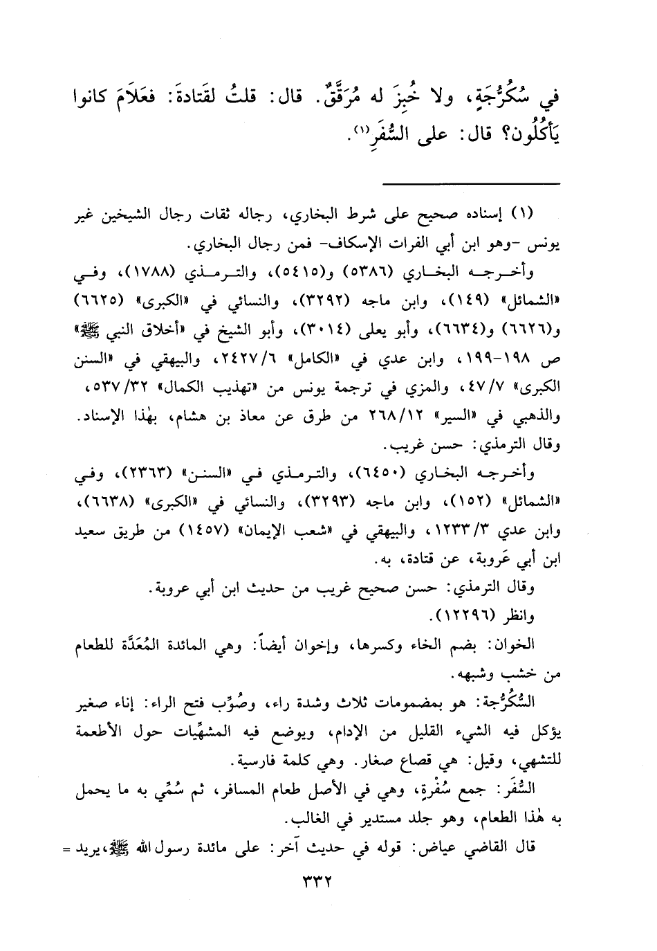 فِي سُكُرُّجَةٍ، وَلَا خُبِزَ لَهُ مُرَقَّقٌ " قَالَ: قُلْتُ لِقَتَادَةَ: فَعَلَامَ كَانُوا يَأْكُلُونَ؟ قَالَ: " عَلَى السُّفَرِ " (١)