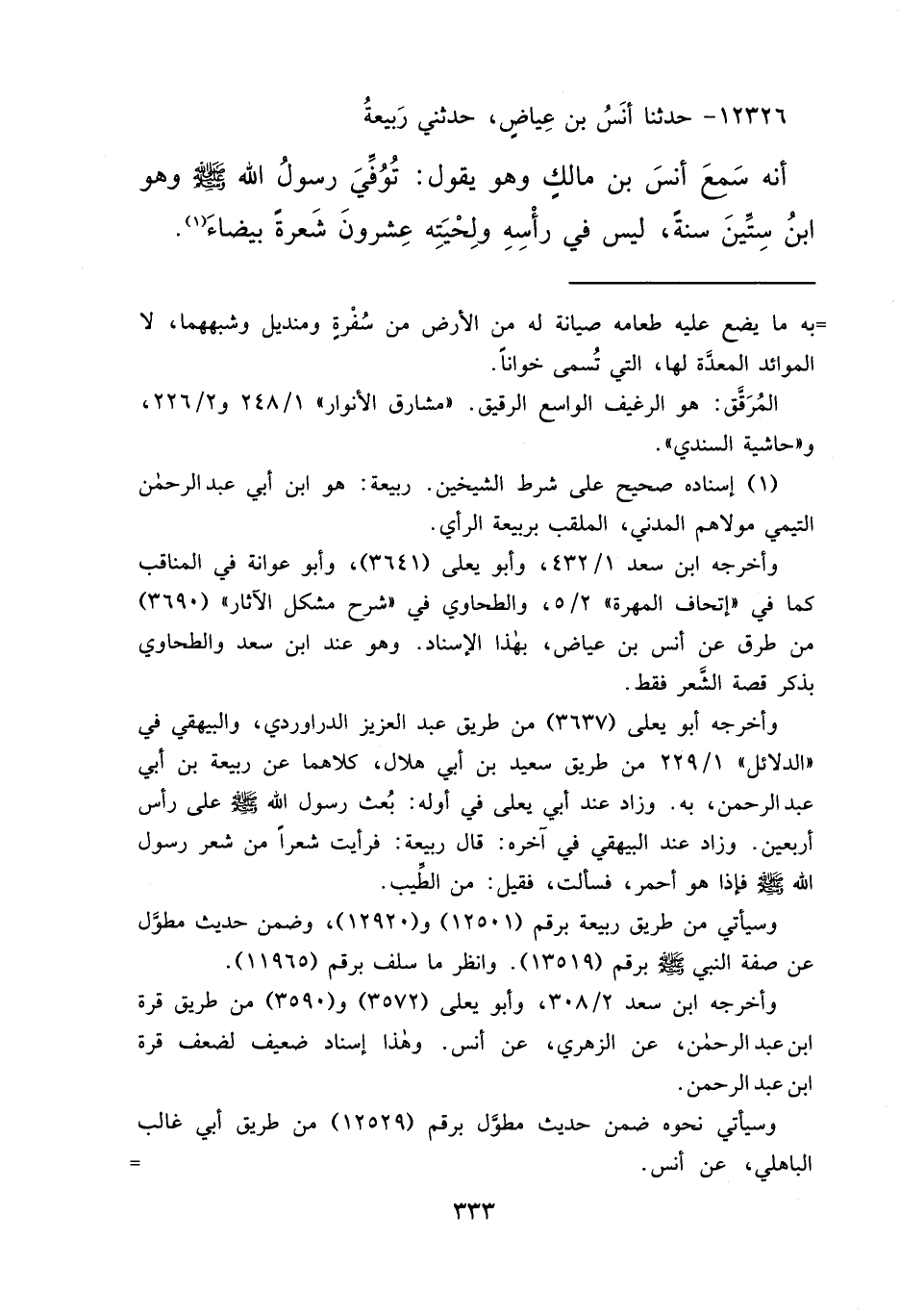 ١٢٣٢٦ - حَدَّثَنَا أَنَسُ بْنُ عِيَاضٍ، حَدَّثَنِي رَبِيعَةُ، أَنَّهُ سَمِعَ أَنَسَ بْنَ مَالِكٍ وَهُوَ يَقُولُ: " تُوُفِّيَ رَسُولُ اللهِ صَلَّى اللهُ عَلَيْهِ وَسَلَّمَ وَهُوَ ابْنُ سِتِّينَ سَنَةً، لَيْسَ فِي رَأْسِهِ وَلِحْيَتِهِ عِشْرُونَ شَعْرَةً بَيْضَاءَ " (١)