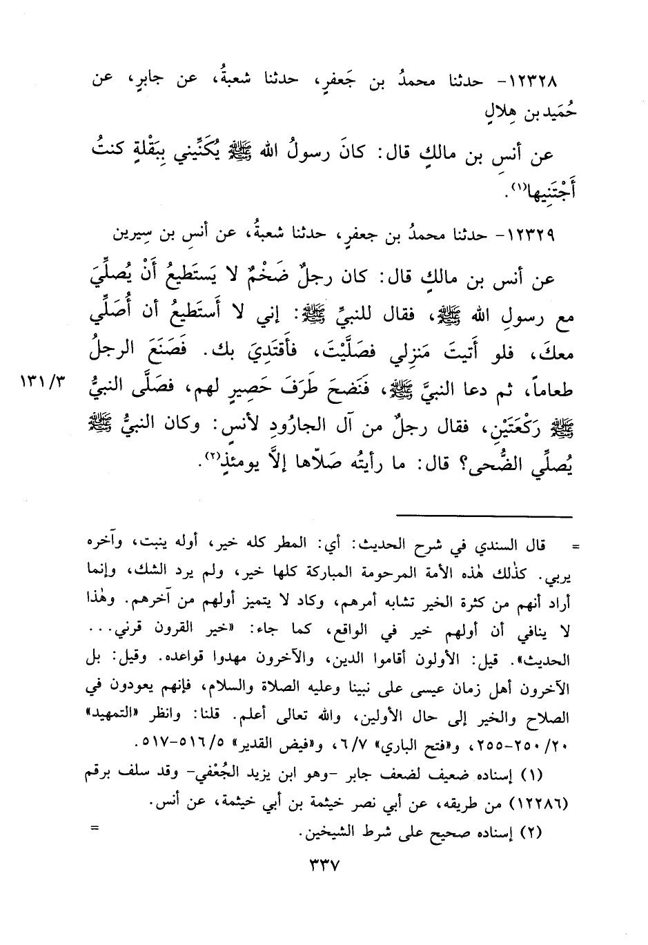 ١٢٣٢٩ - حَدَّثَنَا مُحَمَّدُ بْنُ جَعْفَرٍ، حَدَّثَنَا شُعْبَةُ، عَنْ أَنَسِ بْنِ سِيرِينَ، عَنْ أَنَسِ بْنِ مَالِكٍ قَالَ: كَانَ رَجُلٌ ضَخْمٌ، لَا يَسْتَطِيعُ أَنْ يُصَلِّيَ مَعَ رَسُولِ اللهِ صَلَّى اللهُ عَلَيْهِ وَسَلَّمَ، فَقَالَ لِلنَّبِيِّ صَلَّى اللهُ عَلَيْهِ وَسَلَّمَ: إِنِّي لَا أَسْتَطِيعُ أَنْ أُصَلِّيَ مَعَكَ، فَلَوْ أَتَيْتَ مَنْزِلِي فَصَلَّيْتَ فَأَقْتَدِيَ بِكَ، فَصَنَعَ الرَّجُلُ طَعَامًا، ثُمَّ دَعَا النَّبِيَّ صَلَّى اللهُ عَلَيْهِ وَسَلَّمَ، فَنَضَحَ طَرَفَ حَصِيرٍ لَهُمْ، " فَصَلَّى النَّبِيُّ صَلَّى اللهُ عَلَيْهِ وَسَلَّمَ رَكْعَتَيْنِ "، فَقَالَ رَجُلٌ مِنْ آلِ الْجَارُودِ، لِأَنَسٍ: وَكَانَ النَّبِيُّ صَلَّى اللهُ عَلَيْهِ وَسَلَّمَ يُصَلِّي الضُّحَى؟ قَالَ: " مَا رَأَيْتُهُ صَلَّاهَا إِلَّا يَوْمَئِذٍ " (٢)